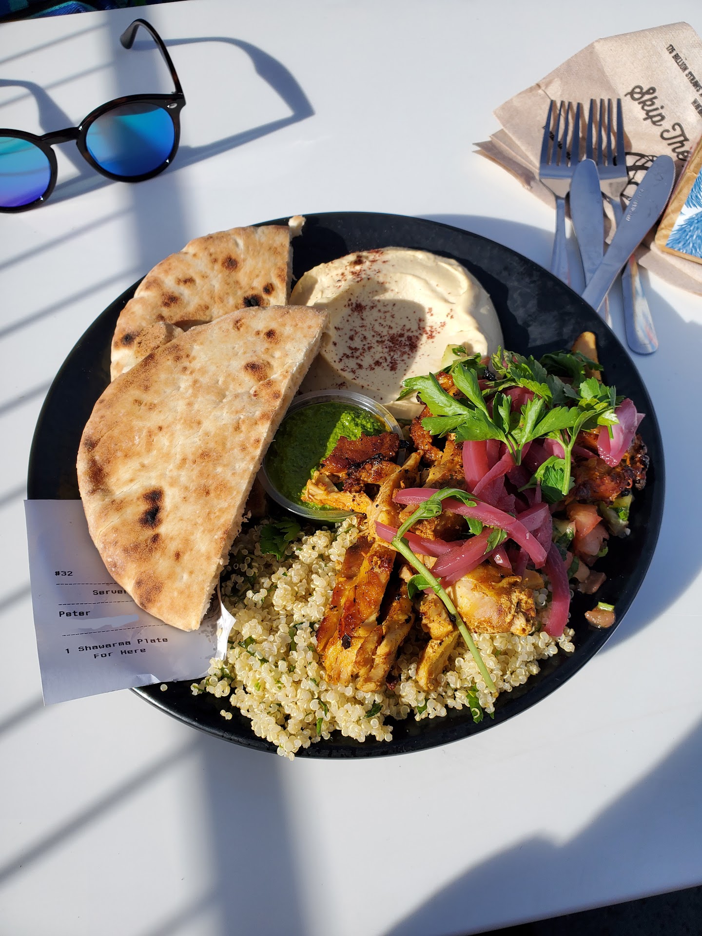 This place was located in a food court like setting which seemed to be pretty happening. We ordered Chicken Shawarma plate, Chicken Shawarma bowl , Falafel Pita Wrap & Zattar Fries. The Chicken Shawarma plate was served with one of the best pita & hummus I had ever had. The pita bread was warm & soft, hummus was rich & creamy, the chicken was well cooked & seasoned topped of with their sauce , pickled onions, diced Tomatoes , cucumbers & quinoa. This dish felt so complete and I can tell the ingredient in there were so fresh and good in quality.