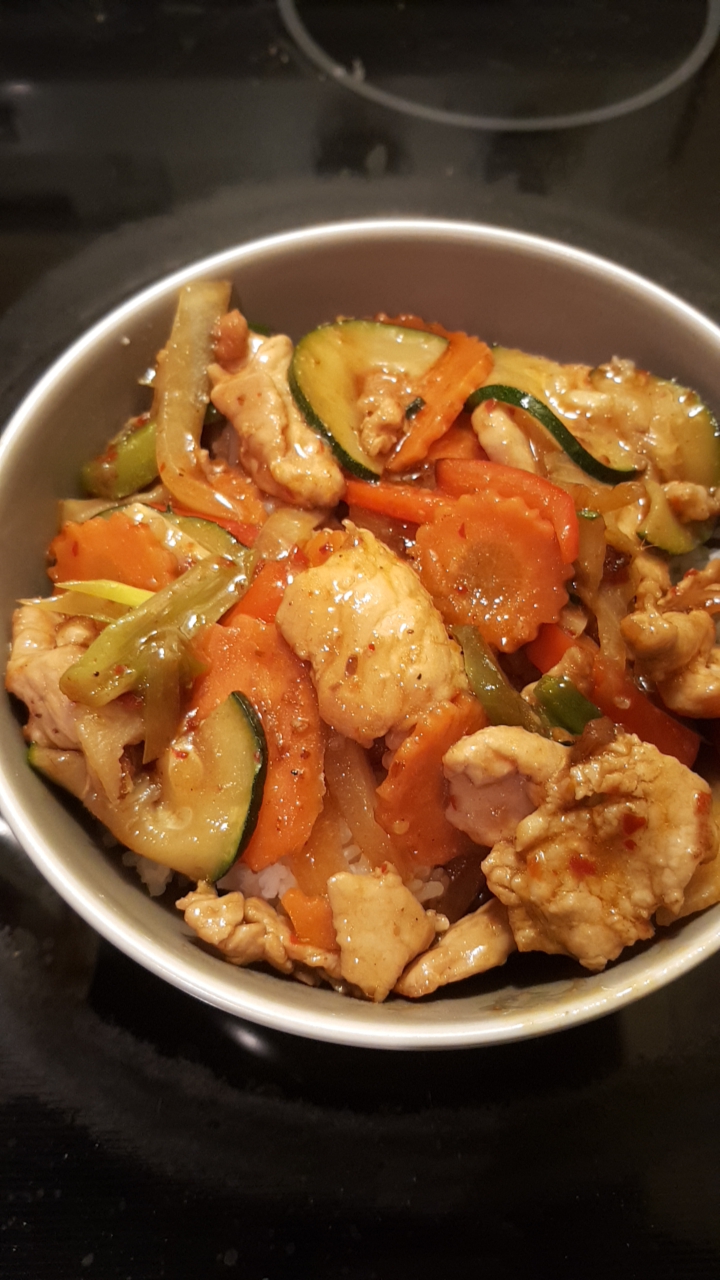 I ordered the pad phet (ผัดเผ็ด) which is traditionally a protein stir fried with red chilli curry paste and a bit of sugar. Maybe you'll find basil or keyfir leaves for a little twist.