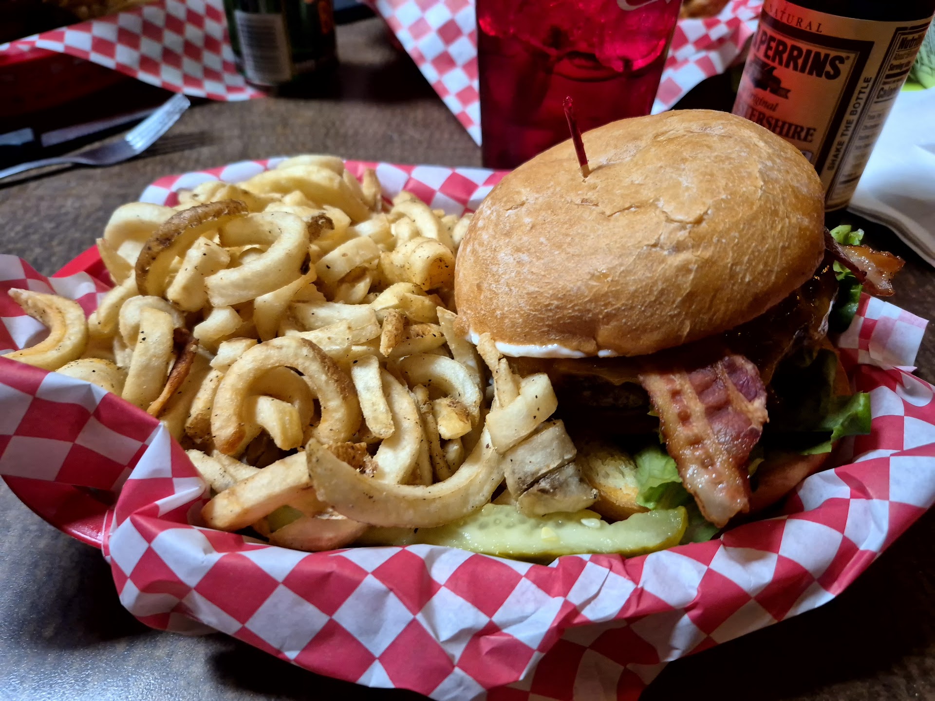 We ordered wings, which were good, and the Rocky Mountain oysters, which I didn’t really like. It didn’t really taste like anything; just fried bits of something weirdly textured/crunchy. I’m still glad I tried it though, because now I’ll never have to order it again. Didn’t seem like anybody else was ordering this though. For my entree, I had the chipotle chicken sammie (charbroiled chicken breast , chipotle pepper, mayo, bacon, pepper - jack cheese, lettuce, onion, tomato, pickle on a toasted bun). It wasn’t anything special: just a chicken sammie that was pretty greasy. I did enjoy the curly fries though.