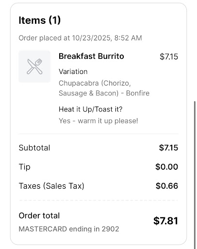 I did like their large menu of flavored mochas (see picture), and some of the baked goods looked delectable. However, the breakfast sandwiches and burritos tasted like they were pre-made and warmed up upon ordering (preformed egg rounds, undercooked bacon). That's fine when I'm at Starbucks at paying less than $5, but for nearly $9 I expect more.