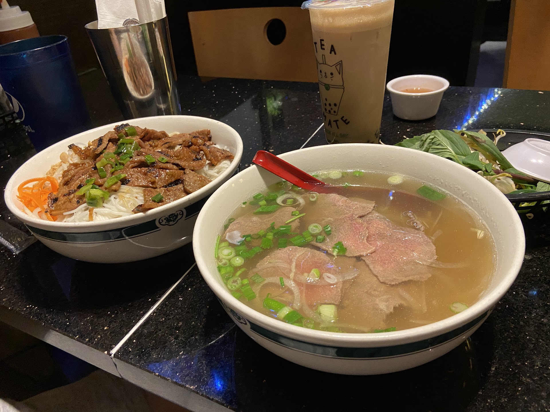 Read moreMy boyfriend and I walked in and were greeted with a gorgeous shrine at the door as well as employees that were absolutely wonderful throughout the entire experience! There were only 2 men working tonight but they did a fantastic job. They were very quick and kind - the food was out in 5 minutes and we were always met with a smile! Usually when food comes out fast, you would expect the quality to take a hit but that was not the case here. I truly believe this was the best food I have ever had in my entire life. I ordered the Beef Noodle Bowl (pictured left) with Lavender Milk Tea with Honey Boba while my boyfriend got the Rare Steak Pho (pictured right) and a Strawberry Limeade. We were eating out of each other's bowls and talked about nothing but how good the food was the ENTIRE time. I've never really liked Pho but I think I would be able to eat theirs every night for the rest of my life and never grow sick of it. My boyfriend lovingly commented "this food is better than any orgasm you've ever given me" and I can't say I disagree with him (he also agreed with me that not only would we be coming back regularly but also that the food was so good we don't think we can eat anywhere else without comparing it). The dishes were not only phenomenal for the prices but we also got plenty of it just by ordering the regular size! We have leftovers that will definitely be eaten within the next 12 hours. I highly recommend Pho Kitchen Bar & Grill to anyone looking for a high quality and beautiful Vietnamese restaurant (or anyone who's willing to listen in general). We got Andy's mints on the way out the door which rounded off our meal nicely.