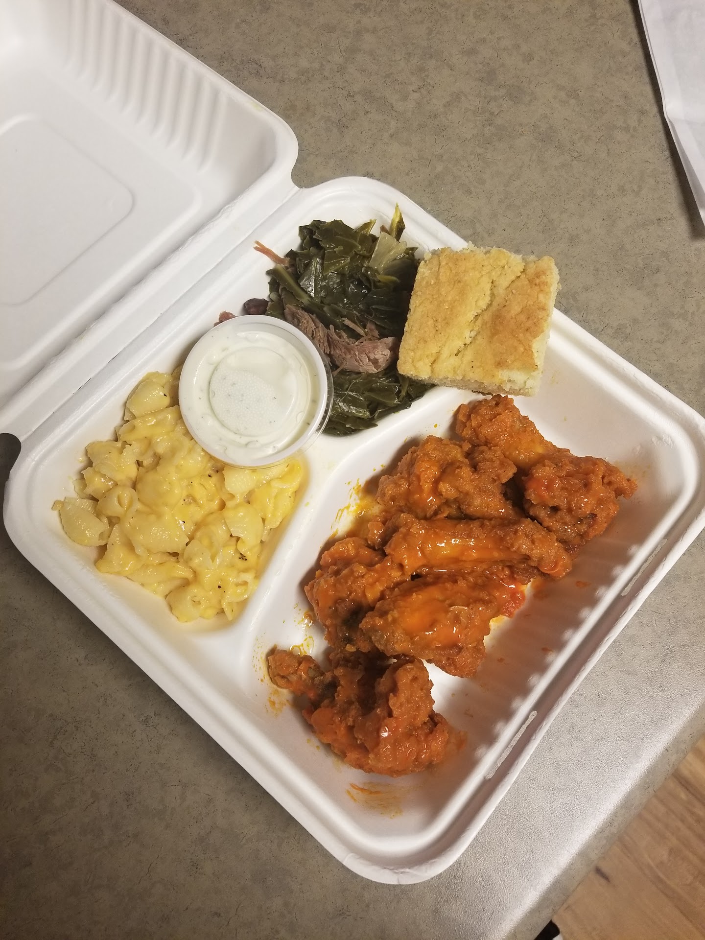 I ended up getting the Pastelillos with sides of mac and cheese, collard greens, and beans/rice. I also chose to get an additional side of cornbread.