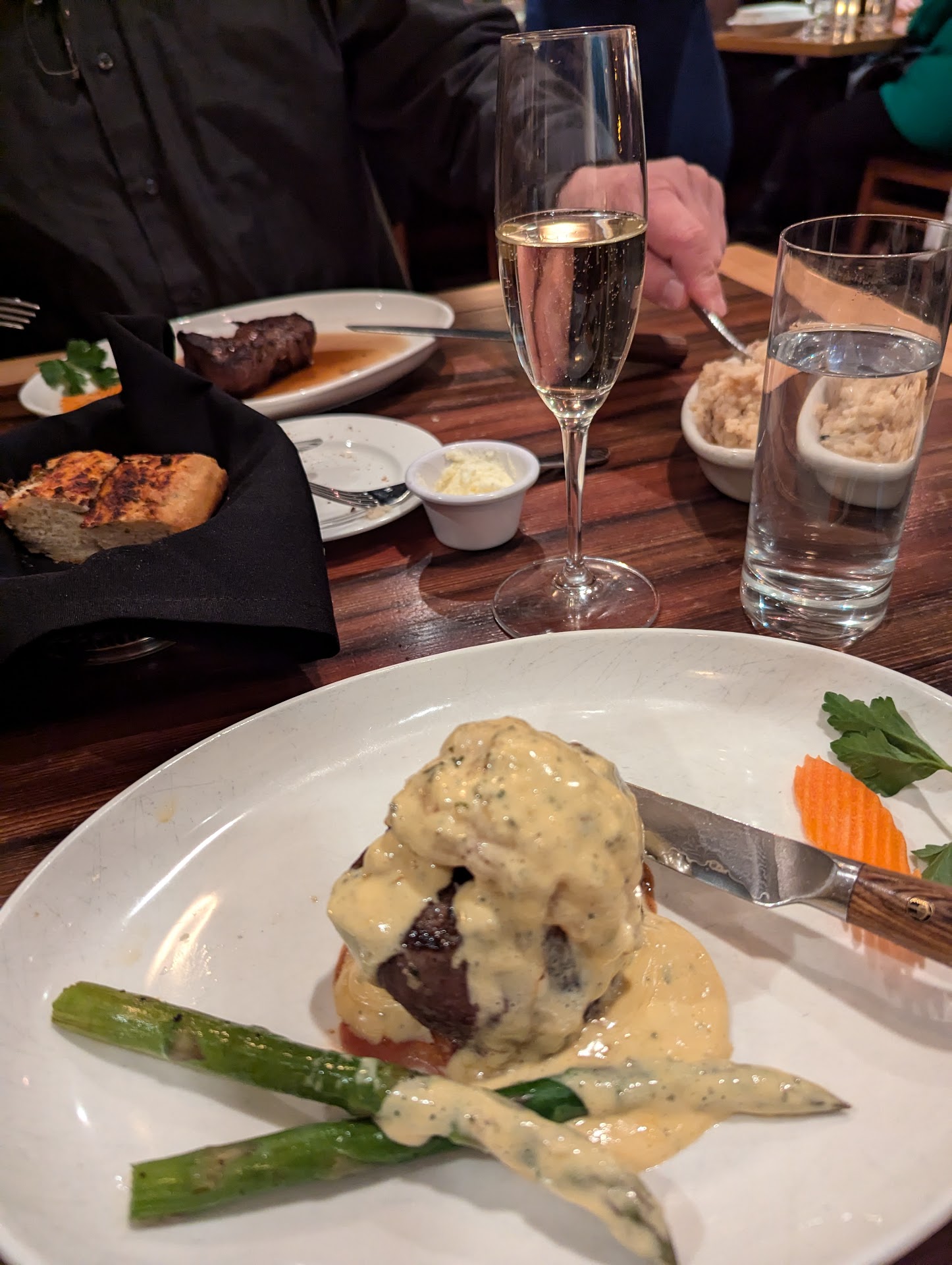 I had the surf and turf special, for $85, and the lobster tail was, sadly, fishy tasting, and not quite the right texture, compared to fresh lobster. We were not impressed with it, but ...I ordered lobster in land locked Colorado. So, that was on me. On the plus side, the texture of the filet mignon was perfect. I usually order between rare and medium rare. And I ate every single bite, every single piece was perfect. Truly perfectly cooked and an excellent thick filet. Colorado knows how to raise cattle, and cut and grill beef. And the Boulder Cork certainly prepares a delicious filet. ( Better than Sonny Lubick's, Still Whisky Steaks, and The Moot House in Fort Collins) For my taste, the "smoked mashed potatoes" are just okay. I think I ate a few bites and I wasn't pleased with it enough to eat more. The two pieces of asparagus that came with my special of filet and lobster tail, were good and fresh, not overcooked, which is unique to Colorado restaurants in my experience. And the Bearnaise sauce was VERY well made and delicious. It's definitely better than mine.