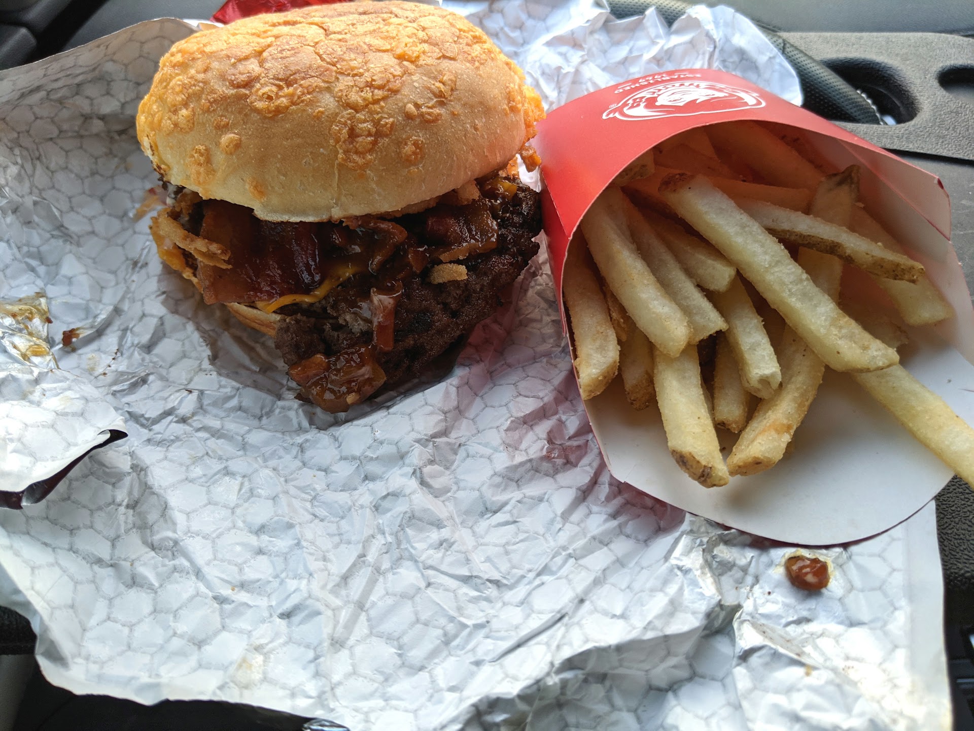 I see a truck in front of me sitting next to a dark menu board, and look down to surprisingly see an order on the microphone box in front of him. So naturally I pull behind him, unaware of the nightmare in horrible customer service from the owner of this franchise location himself, not to mention the twice fried fries.