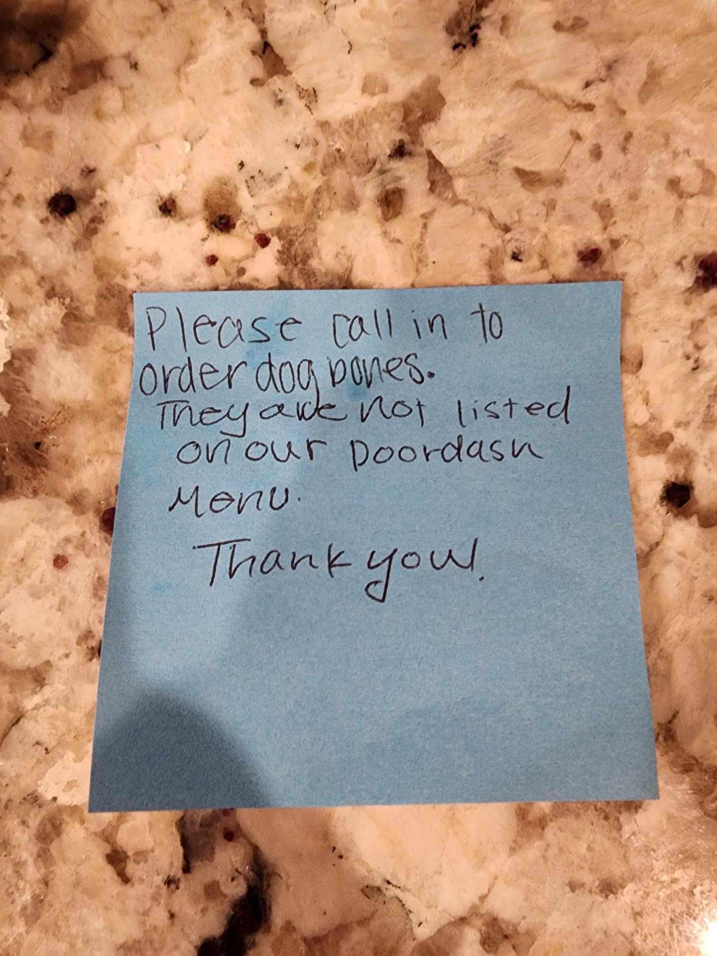 Blue sticky note (picture) is from 2 orders ago. I had a note about a missing bone and that they had put my name on a list. "Please call in to order dog bones. They are not listed on our Doordash menu. Thank you". I order through their app/website because of the rewards program..not doordash unless there's a promo going. Which is almost never.