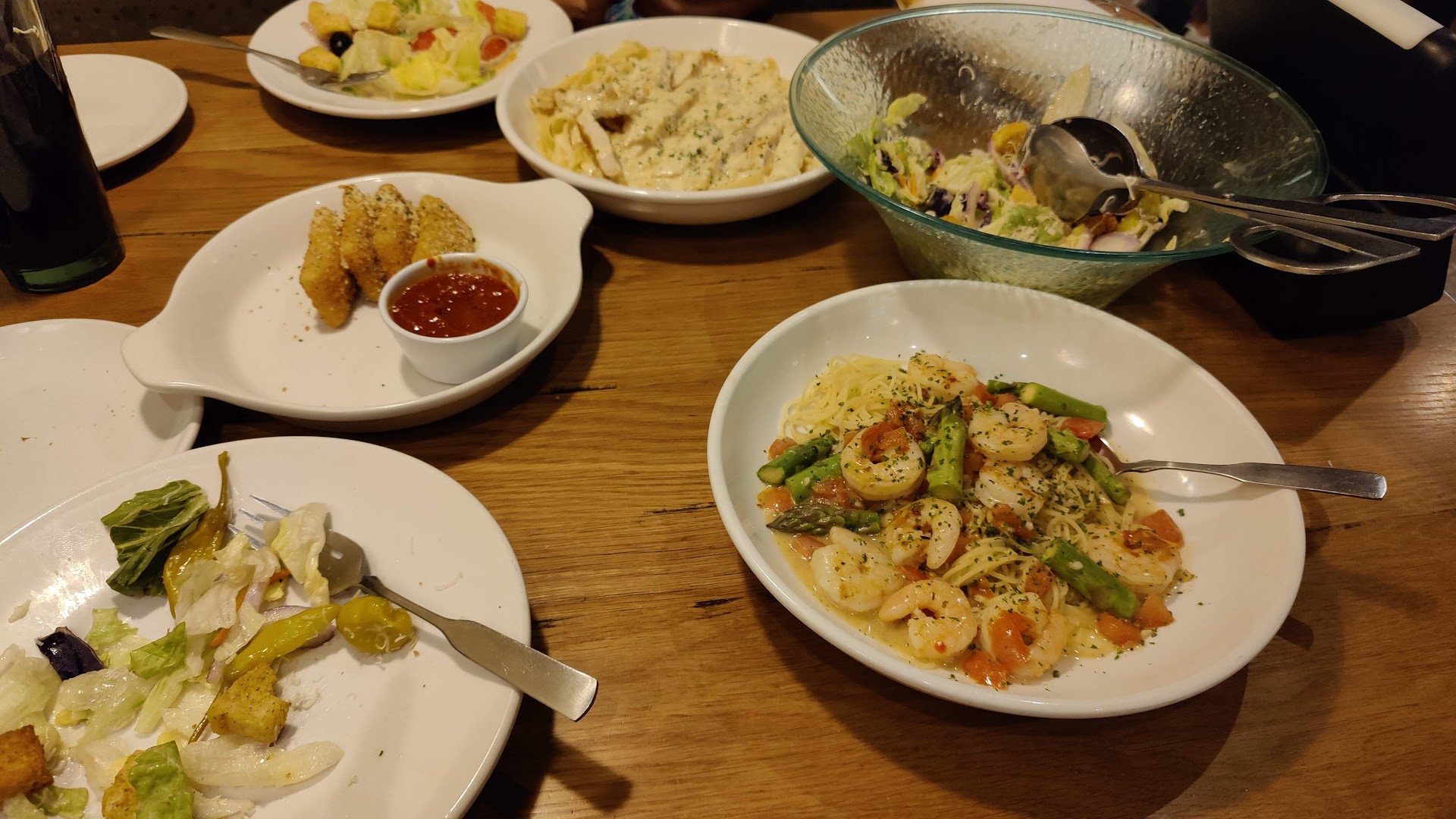 Read moreWe went to Olive Garden to celebrate good grades with our kids. The waitress and service was great. They split an adult entree for our 12 year old twins to share without charge. They kept us stocked on bread sticks. No complaints on service. The food was not very good though unfortunately. We've been to Olive Garden a number of times to compare this experience to previous meals. The bread sticks were overly salted. We were all trying to brush off garlic salt that was crusted onto the bread with butter. My children liked their meals (cheese pizza - how can you mess that up and ravioli) but we did not. My husband ordered spaghetti that was overcooked and almost soggy. I ordered fettuccine alfredo with chicken (always my go to). The chicken had a weird texture. It was almost like they tried to tenderize it or flatten it but it gave it a strange mouth feel that was not appetizing. My husband also tried my chicken and felt the same. I paid extra for chicken that I set aside and didn't eat. The atmosphere was typical Olive Garden dining, nothing fancy and a relaxing dining area. We were seated by the kitchen with servers frequently passing by and also loudly saying "corner" around corners or "coming in" to warn at swinging kitchen doors. It was understandable fire safety but also very distracting. My kids started getting a laugh every time the staff would loudly announce themselves. Overall I'm strongly weighing the food in this review. With prices going up I expect to at least have similar taste/value that I did before at Olive Garden and this just missed the mark. I don't think we'll return to Olive Garden...