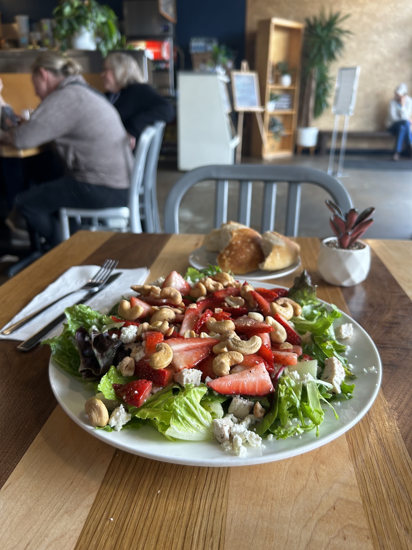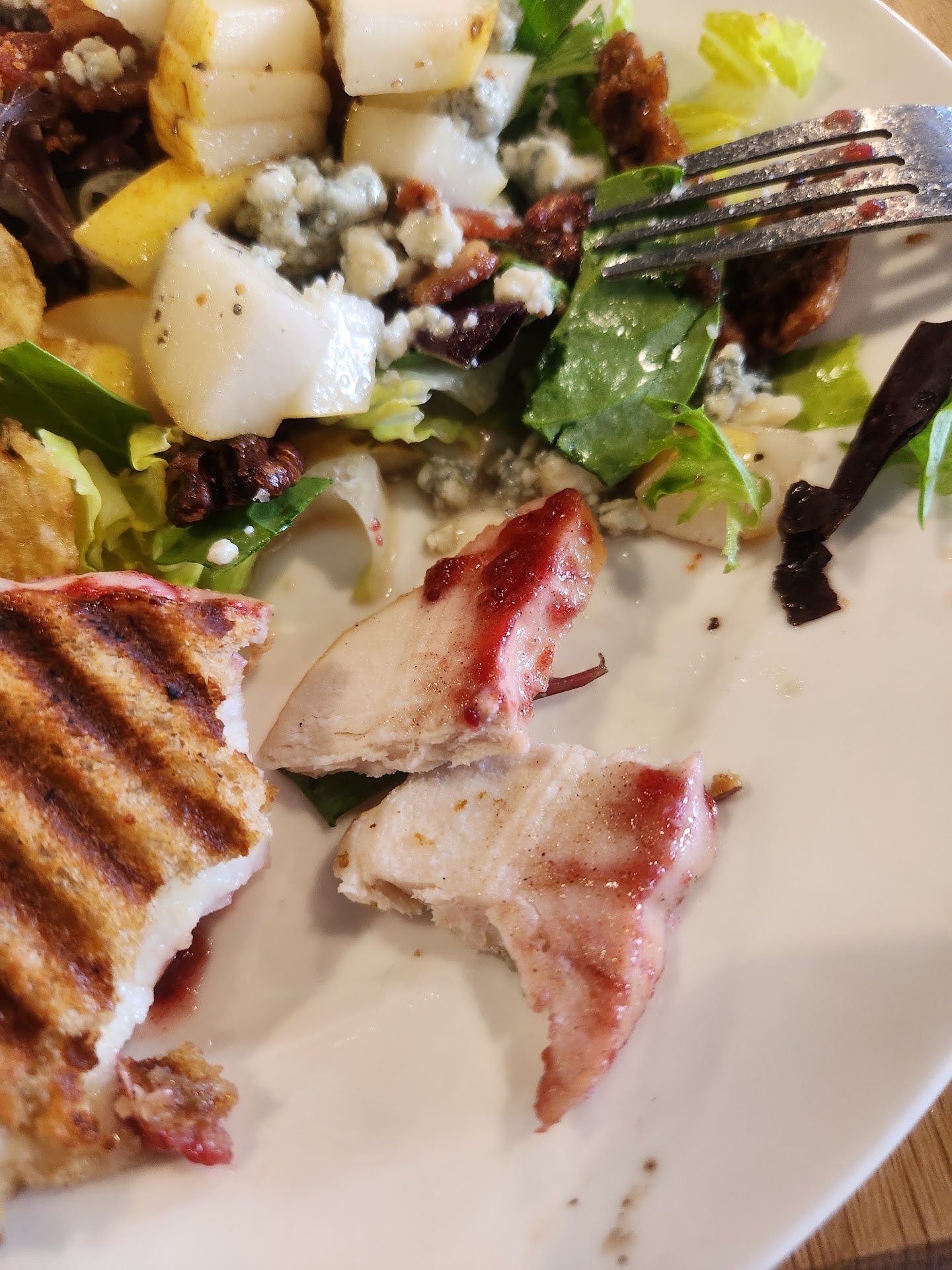 Read moreWas looking for a light lunch and had driven by many times. When you go in you order right there and take a seat. You are not given an order number or anything for your table. They do something to "know" who you are. They bring your drink and order out shortly. I arrived a little after 1 pm and the restaurant was full. This meant that the sound level was extraordinary high. I am not sure how other hear and did notice an older couple who did not converse during the meal. I have hearing issues and am not sure i would have been able to hear a companion. The restaurant emptied a bit by 2 making it should level more tolerable. The wait staff leave you alone but check on you more frequently as you near ending your meal. They offered a to-go drink. No bill brought to the table and they had the right order at the check out. There is a 3.5% charge if you use a credit card. I would have liked to have seen that sign at the order counter. The food was great. I had 1/2 salad and 1/2 sandwich. I had a turkey and cranberry panini. You can see the thicker turkey in the photo. Cranberry sauce was homemade with a slight touch of clove and other spice. So mild you would not initially notice. The cheese was unexpected. The pear and pecan salad was lite and had a crumbled blue cheese and bacon. Flavors blended well. The food was quite good and service was excellent. I would go again but will choose a more off peak time so it might...