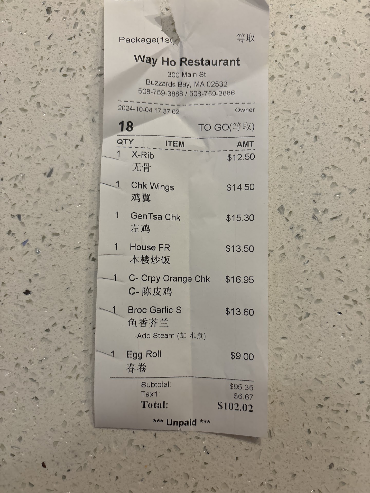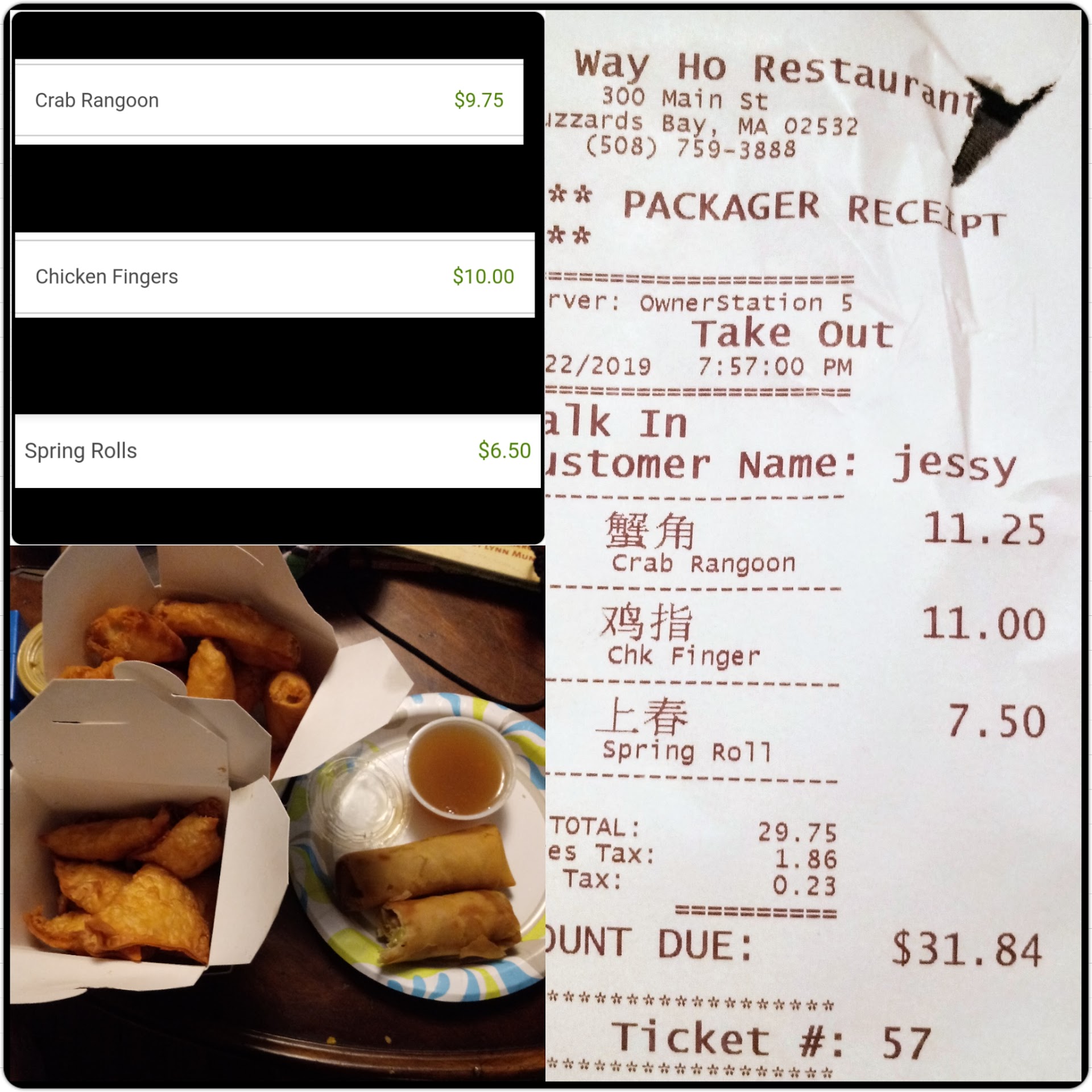 Read moreMy husband and I went to Way Ho with 2 of our friends recently- arrived late- 9:45. They did say kitchen was closing at 10, but hours are until 12 am. The waitress was sort of straight faced at first, but when my friend joked with her, she was very charming - so just be nice to them and they are nice back :). The bartender?- I believe? came to clear plates and help with anything else we needed. He was so very kind, and I thought it was great that everyone works together like that. The food arrived very quickly. The Bok Choy was one of the best things I have ever eaten- REALLY!! It was garlicky,steamed perfectly and just plain heaven. Tip- if you like Brocolli Rabe, you will love it- tastes even better. The price is a little high, but that was worth it. The crab rangoons were very good- nicely proportioned. Lo Mein was pretty good. Shrimp with vegetables was very fresh, although could use a variety of veges, not just carrots and peapods. Unfortunately, the boneless spare ribs were fatty and greasy- not too good. All in all- good experience, just depends on...
