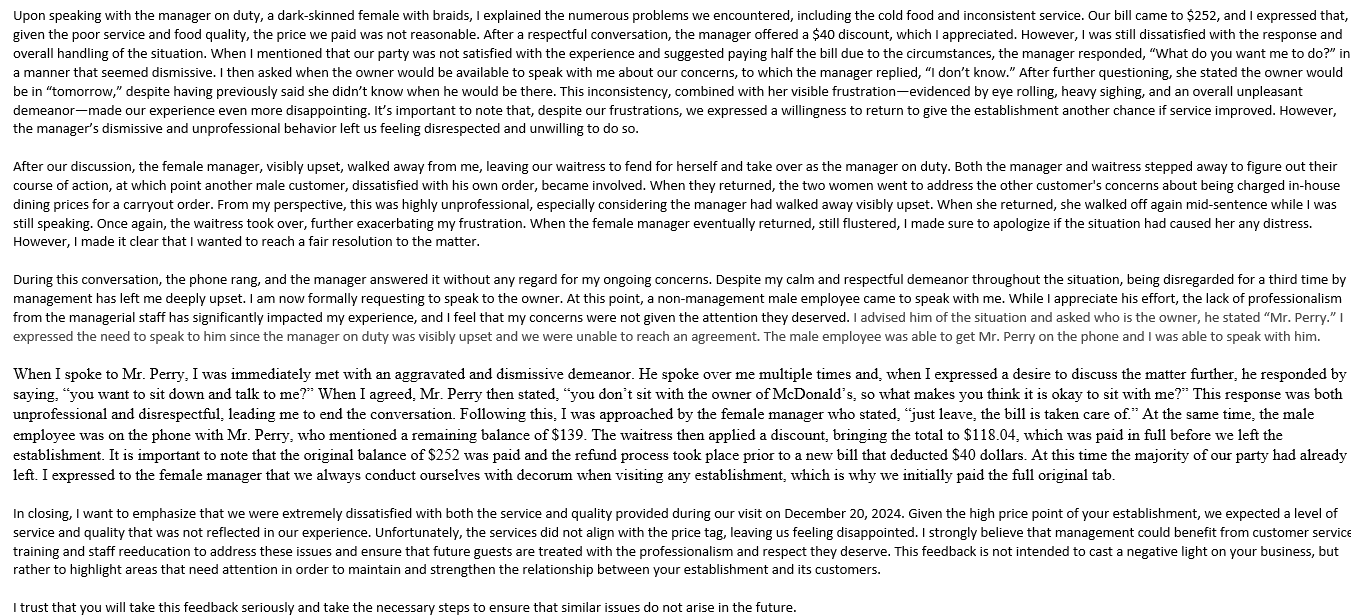 Upon speaking with the manager on duty, a dark-skinned female with braids, I explained the numerous problems we encountered, including the cold food and inconsistent service. Our bill came to $252, and I expressed that, given the poor service and food quality, the price we paid was not reasonable. After a respectful conversation, the manager offered a $40 discount, which I appreciated. However, I was still dissatisfied with the response and overall handling of the situation. When I mentioned that our party was not satisfied with the experience and suggested paying half the bill due to the circumstances, the manager responded, “What do you want me to do?” in a manner that seemed dismissive. I then asked when the owner would be available to speak with me about our concerns, to which the manager replied, “I don’t know.” After further questioning, she stated the owner would be in “tomorrow,” despite having previously said she didn’t know when he would be there. This inconsistency, combined with her visible frustration—evidenced by eye rolling, heavy sighing, and an overall unpleasant demeanor—made our experience even more disappointing. It’s important to note that, despite our frustrations, we expressed a willingness to return to give the establishment another chance if service improved. However, the manager’s dismissive and unprofessional behavior left us feeling disrespected and unwilling to do so. SEE...