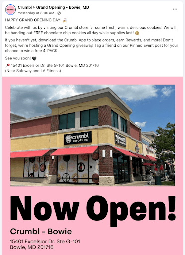 Read moreDeceptive advertising for the Grand Opening. I saw Free Cookie Day on Instagram and was excited to get a free cookie. Only told once I arrived that it was free chocolate chip cookie WITH PURCHASE. No where on Instagram or this Facebook post does it indicate that. I have no problem with the business trying to earn money but this was not the way to advertise that. I still got my cookie which was delicious but it's not right to do a bait-and-switch with the offer. Don't say free cookie if it's really buy 1 get one free. Not a great start to the new location. Hoping for better things in the future here.