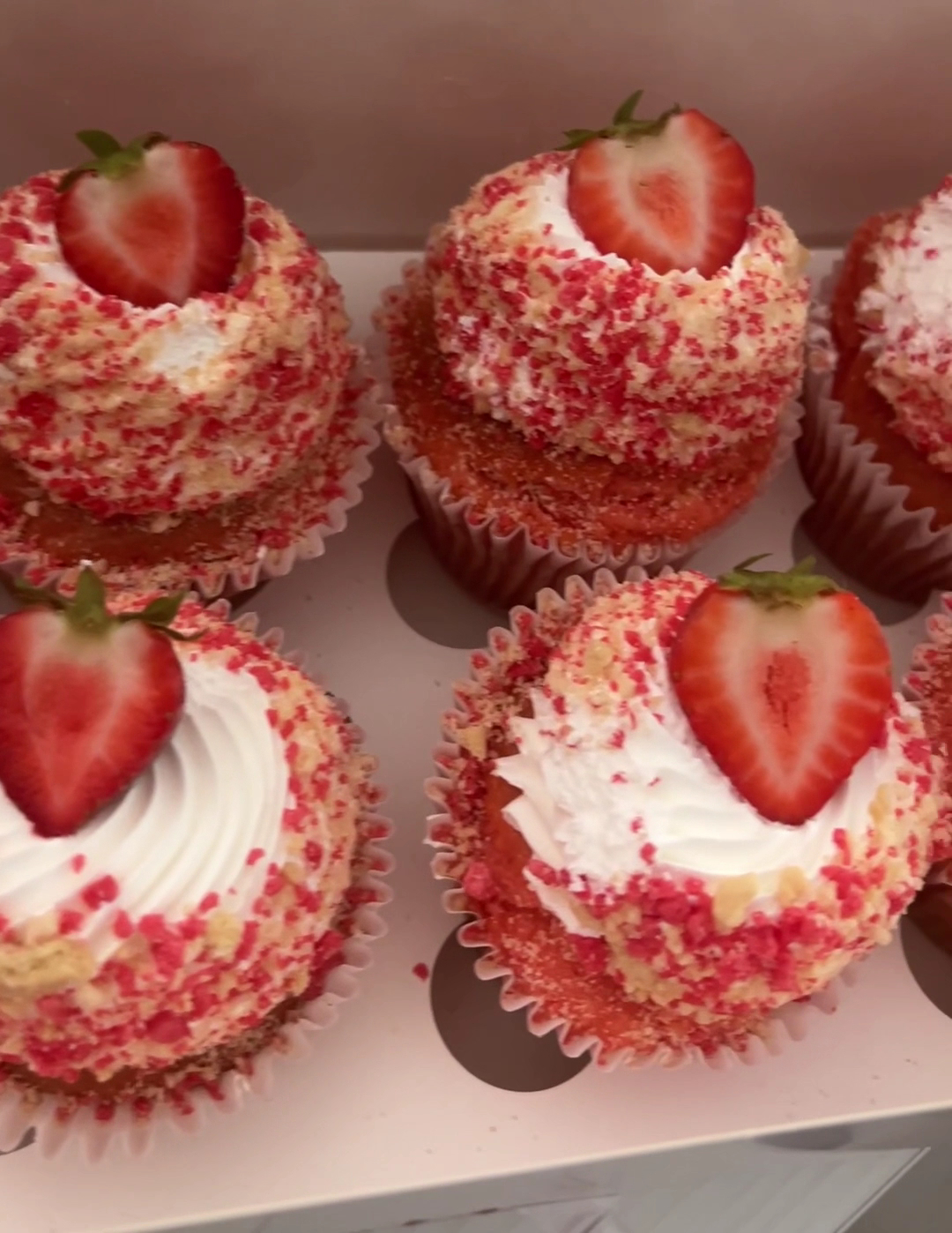 Their Gourmet Cupcakes: ($4.95 Each) Their Strawberry Crunchā¦STAMP!! Moist. soft, with real strawberries!!