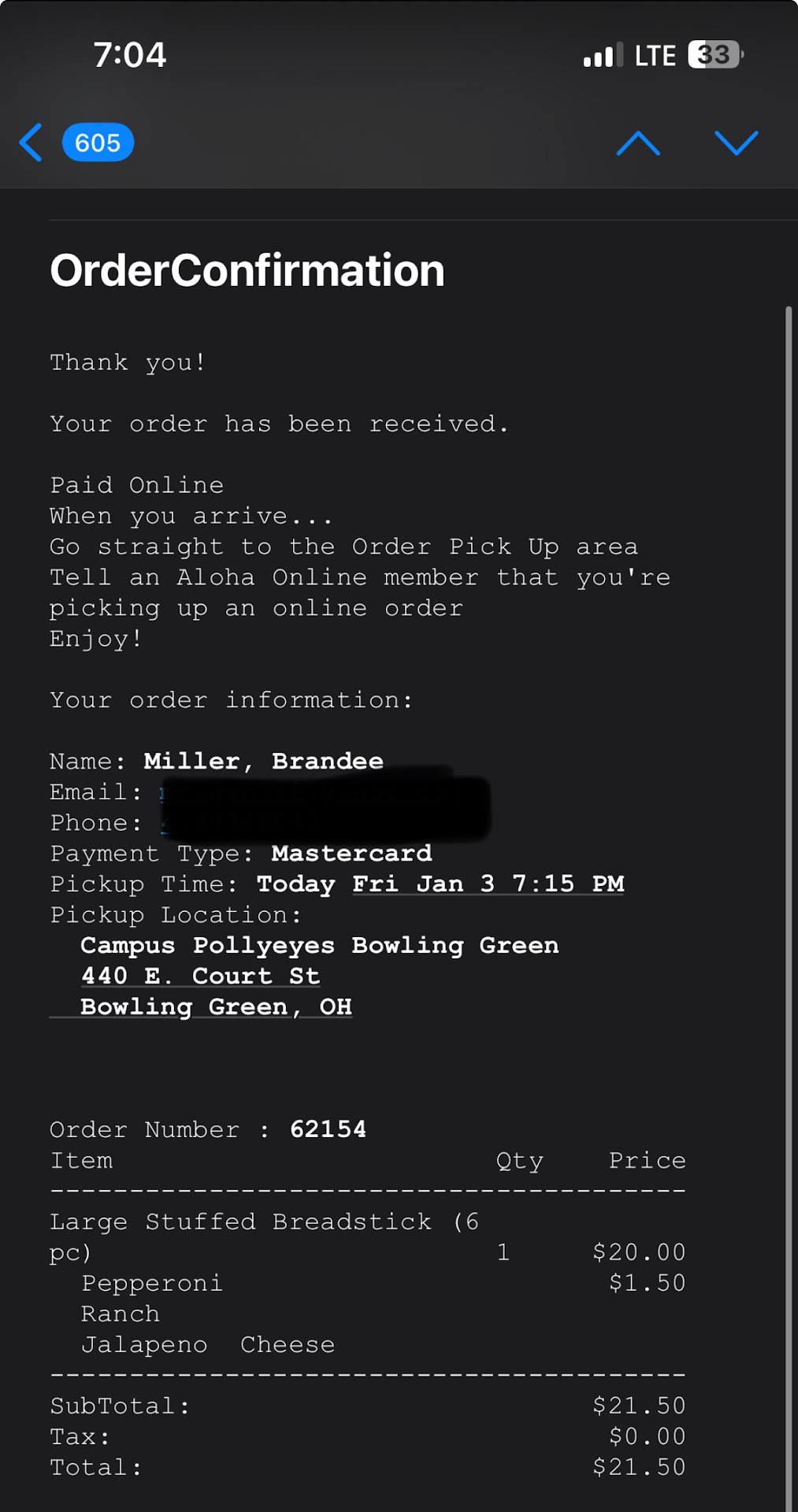 My sister asked us to pick up some breadsticks from Pollyeyes since she lives in Toledo and they no longer have a location. She placed the order online at 6:26 pm and received a confirmation email, which stated that her order would be ready by 7:15 pm. Her total was $21.50 and she paid online with a Mastercard.