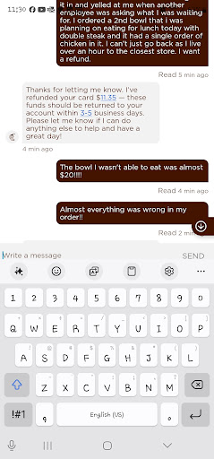 Don't waste your money here. I placed an order on the app and almost everything was wrong. I ordered 2 bowls with a tortilla on the side and a burrito. When I got my food my burrito was made as a bowl and my tortilla on the side was missing. So I brought my food back in to be fixed (I live over an hour away and can't eat a bowl driving down the road), and when I did the girl with black hair was very rude and irritated that I didn't just eat what they gave me. I was waiting for a good 15 minutes when another employee asked what I was waiting for. I attempted to tell them that I was waiting for my food to be remade and the girl with the black hair came over and yelled at me saying she was taking care of it. Wow! I know they were busy so I just chopped it up to a bad night, took my remake and told her to have a good night. One of the bowls I ordered was for lunch today, I ordered a steak bowl with double protein. When I went to eat it it had a single portion of CHICKEN!! I paid for double steak just to get home and find chicken in my bowl! I have a kid with alpha gal! The only time I don't eat chicken is when we go out to eat!!! Not to mention the steak is almost $3 more than chicken! So I reach out to customer service. At this point I'm pissed. I spent over $42 on 2 bowls and a burrito. They come back and offer me a free drink oh and it expires in 30 days. I live over an hour away! There is no way I'm gonna make it anywhere near a store in the next 30 days. So I ask for a refund. They come back with, I've added a free entree to your account but it expires in 30 days. What part of I can't make it out there in the next 30 days did you not understand! Come on people! Then they disconnect the chat and I have to go back through all of this again to get a live agent who wants to give me $11.35 refund. My bowl that was completely wrong was almost $20!!!! Ultimately I ended up with a refund of $17.91, a giant headache and 2 freebies that will expire before I'm in a town with a Chipotle again. Like I said don't waste your money here. This place is a joke and the employees don't want to be there and make it very obvious. And to the girl with the black hair, find a new job! You obviously...