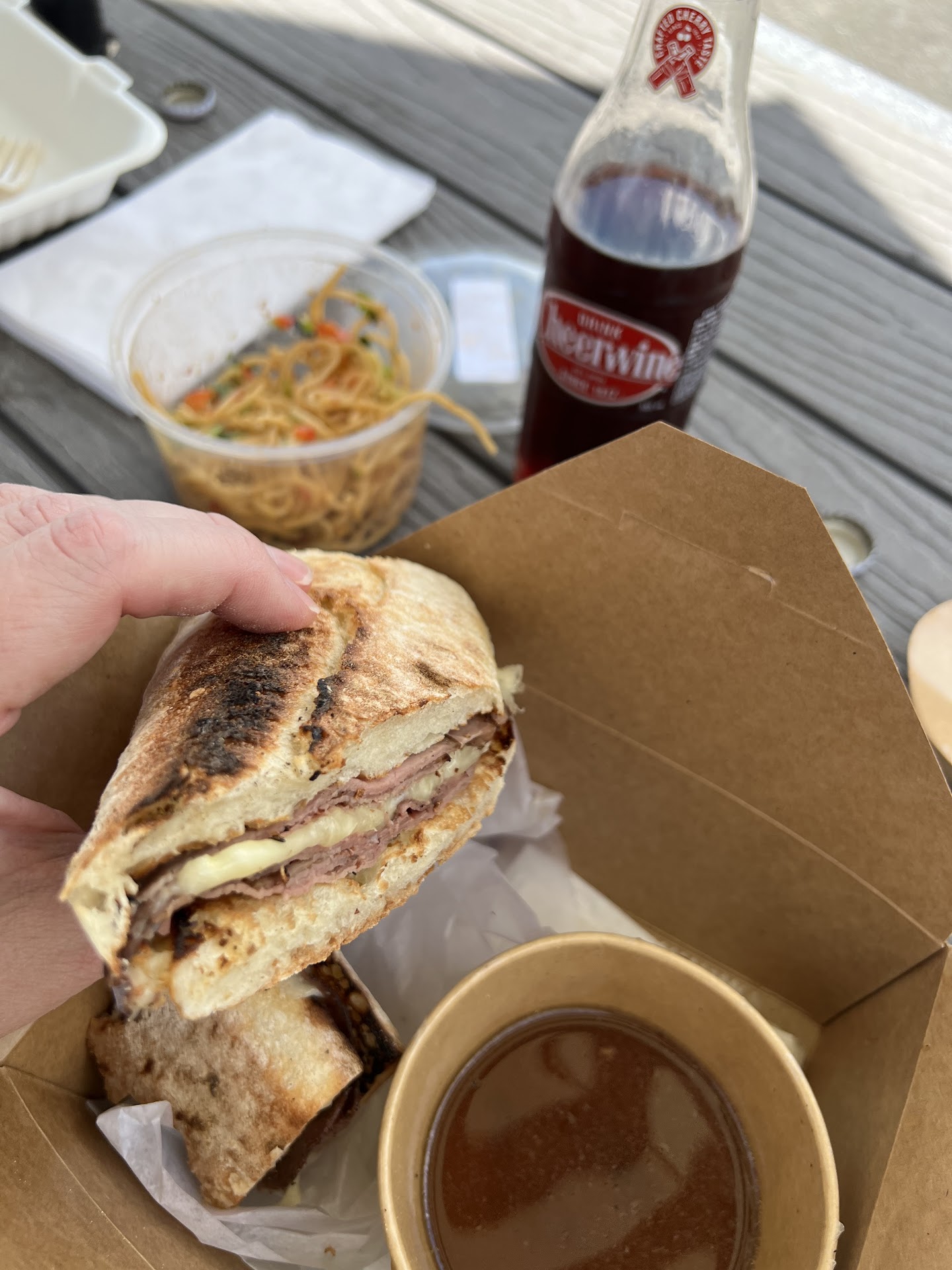 I am so in love with this place! You can sit inside or outside, we sat outside. I’ve been here before and had the fried buttermilk chicken sandwich & hand pies and they were both so good. This time I had the French dip and it was the best French dip I’ve ever had! The bread was toasty and delicious and the roast beef & au jus was so flavorful! My husband and I shared the Thai cold noodle pasta and it’s our favorite!! Washed it all down with a bottle of Cheerwine. My husband had the pulled pork sandwich with coleslaw, which I tried a bite of, and it was so so good! The pork was very flavorful and tasted like it had been on the smoker for hours…which it probably was because they do have a smoker outside. Everything was so delicious, we can’t wait to come back again! Glad we...