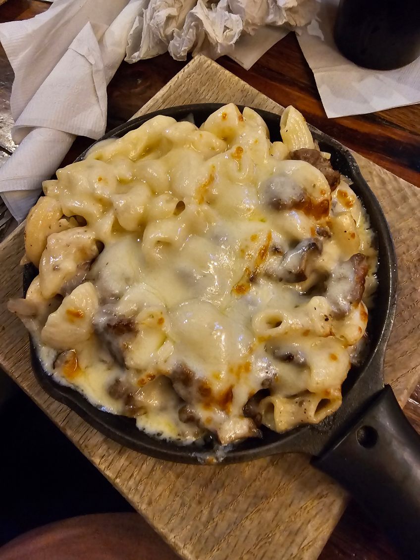 Enough with the theme, because seriously, I could go on forever. Let's get to the meat of it. 😅 I'm not actually a hot dog person, so I ordered what caught my eye, the Stroganoff Mac N Cheese. I was NOT disappointed. It was finger licking good, and I'm probably going to replicate it at home, to be honest, because it's genius. The husband got the pot pie, and it was also fabulous! These are both items I wouldn't normally get at a sports bar type restaurant, but they have nailed these items! Even the side order of mac n cheese we ordered for the kid was great.