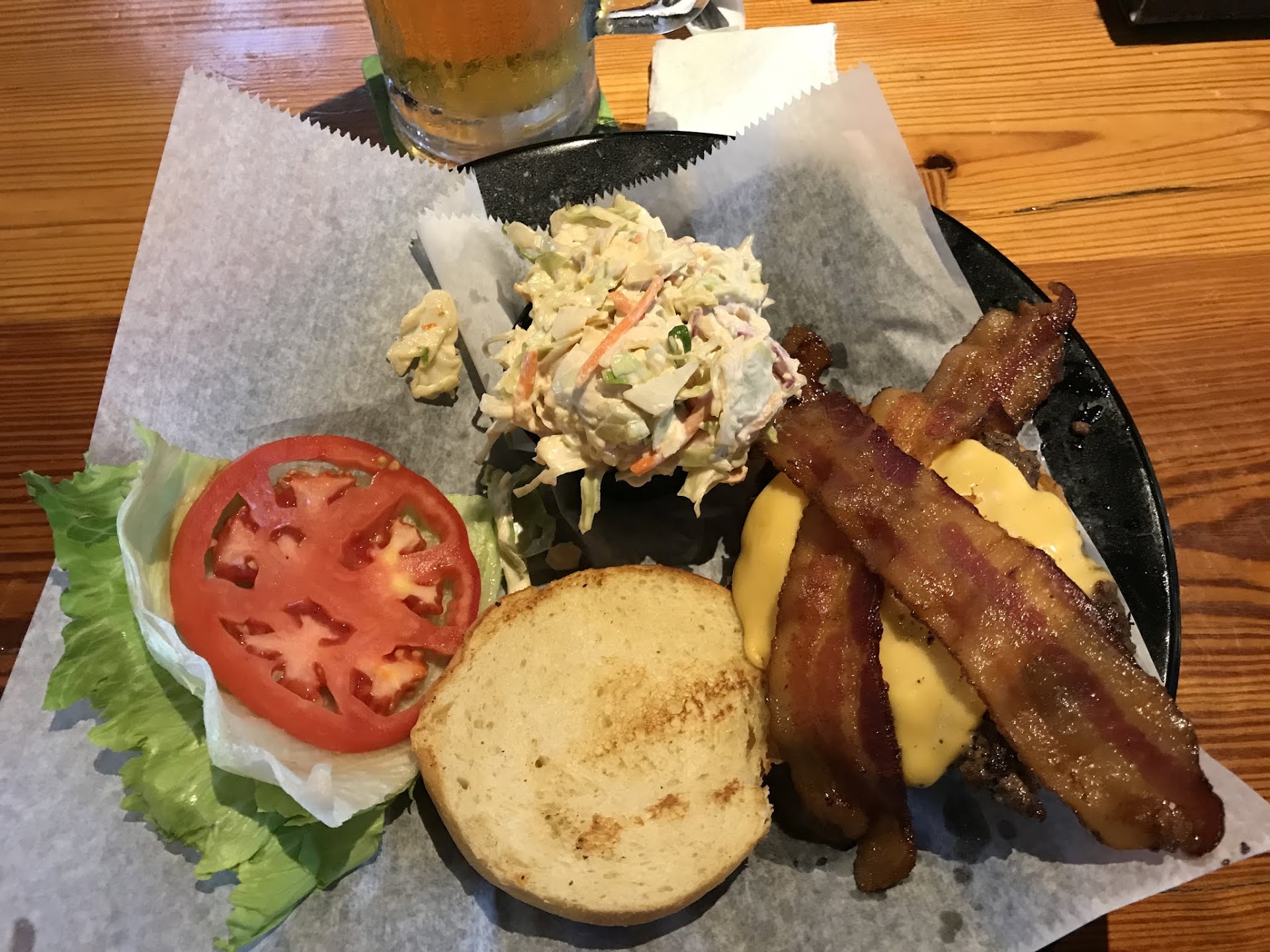 July 2018: Visited Double Dog’s on a recent road trip and was very impressed. Went with their Double Dogs Diddley Lager from Braxton Brewing Company…exceptional draft beer. I was soooooo tempted to order the steamed hot dogs (the New Englander in me was screaming go for it) but decided on the Bacon Cheeseburger and Creamy Slaw. Now the waitress (Jessa) warned me that their slaw was made with 1000 Island dressing versus Mayo. The burger was perfectly cooked and the bun was exceptionally good…I think it was a Brioche style but not sure. The Cole Slaw…WOW. Totally different than any slaw I have enjoyed and the 1000 Island dressing was really a compliment to the cabbage. The service was great and other items on the menu I saw go by looked delicious, especially the Bo's Dog Bowl Nachos and Stroganoff...
