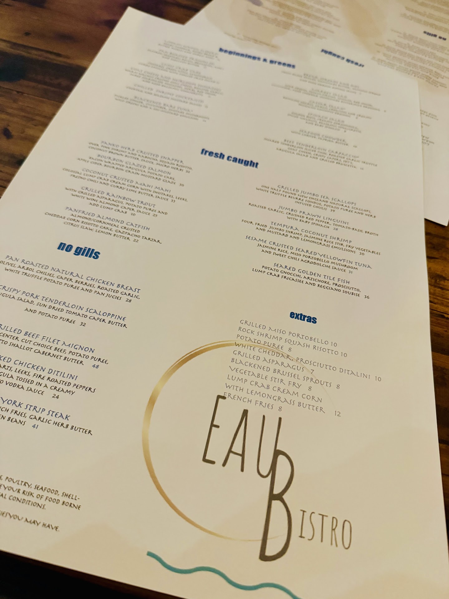We went to Eau to celebrate our anniversary. When we arrived we noticed that there were 2 different dining areas. We ate in the bar area. At first look it was a romantic elegant setting. It had low lighting and candles on the tables. The wait staff was friendly and dressed very professionally in black pants and shirts. Then we noticed that there were big screen tvs over the bar with spots playing and they were playing country music. The bartender was wearing a sweatshirt and jeans. She looked very unprofessional and not at all keeping with the rest of the staff. It was confusing as to what kind of atmosphere they were going for... elegant and romantic or sports bar. The other side of the restaurant was more brightly lit, but looked like a nice area. If that side had dimmed lighting and candles it would be very elegant and romantic. Linen tablecloths would really put it over the top. The menu is definitely fine dining. We had the goat cheese and heirloom tomatoes as a starter and it was superb! For entrees my husband had the New York Strip steak which was tender but lacked flavor and I had the scallops. The scallops were tasty but the plate looked bland. The scallops are white in color and they were served with pureed potatoes all on a white plate. They did give us a free chocolate cake with ice cream and raspberry puree for our anniversary. The dessert was delicious, but the raspberry only consisted of 3 drops on the plate. It was more for presentation than taste. I definitely think this restaurant has potential if they can get their...