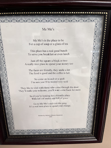 We always look for small town Ma & Pop places to eat on our travels. Me Me’s didn’t disappoint. I enjoy extra crispy bacon and they made it perfectly. The food was excellent. The waitress was sweeter than pie. We bought two jars of locally made jelly. We pull a small travel trailer and it’s always hard to find parking. We did use the empty lot of the insurance agent next door (who’s not worth mentioning by name). We left a note on the door explaining our need. We were in and out of Me Me’s before his business hours started. He was just pulling in and when he got out he was obnoxious. Small town charm stops at the edge of...