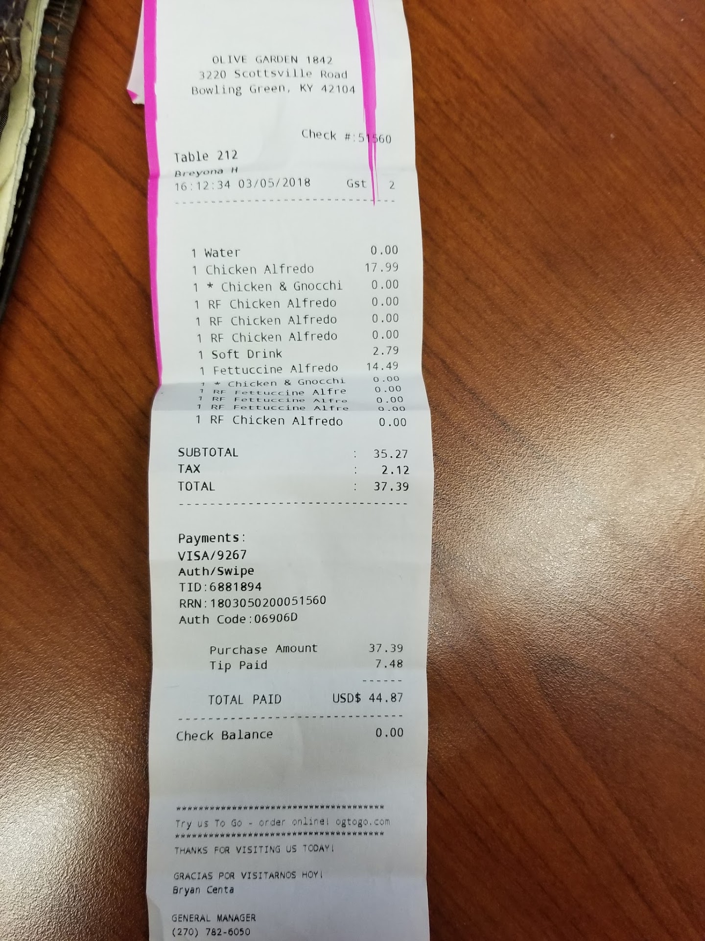 Attached is the receipt of ONE of the unlimited chicken alfredo meals.
