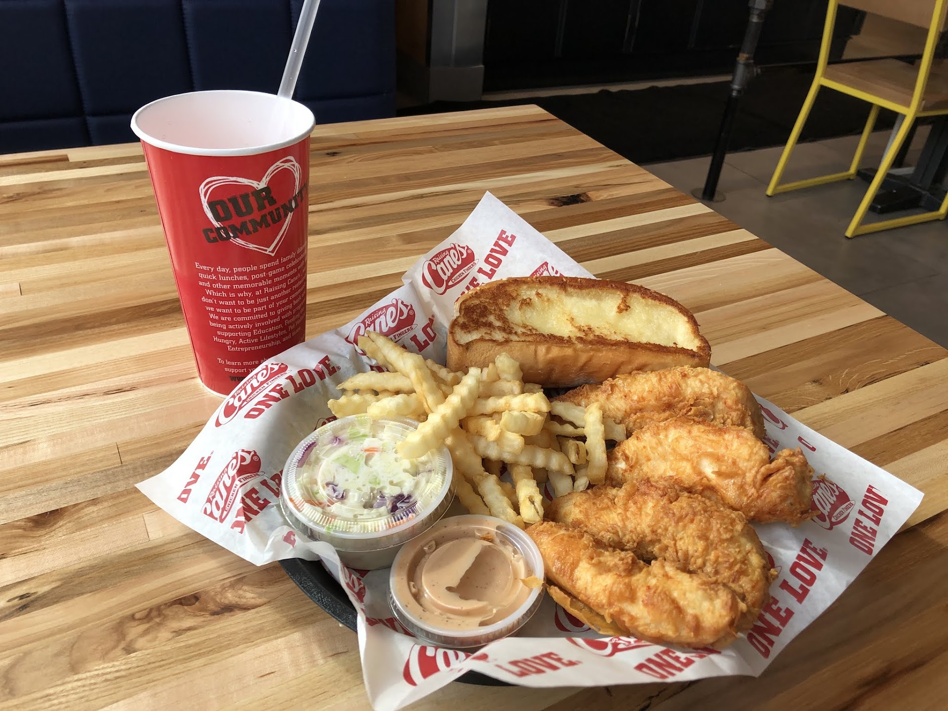 From Atlanta, and although we are familiar with Cane's with our travels, we needed to study the menu. While seated, and reviewing the menu, the restaurant just exploded with customers. Being a Sunday, there were a lot of sports teams seeking a meal. Much to our surprise, and satisfaction, the crowd was quickly handled and we were able to place our order quickly.