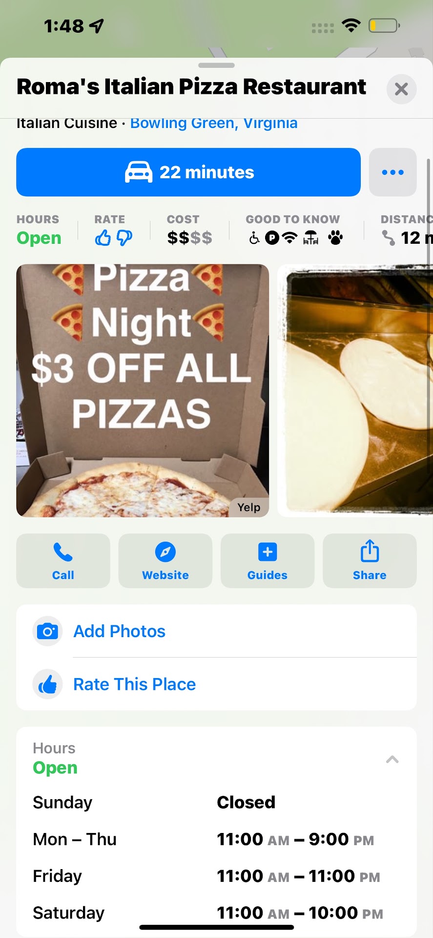 Read moreThe pizza was not too bad, too many onions, but I was appalled when I found out how much it was costing me! They did not tell me after I placed the order, so I waited for the total when they brought the pizza here! Low and below I was flabbergasted to find it was going to cost $60+! For two lousy pizzas! Had I known before hand I would not have agreed to that! I’m in Bowling Green Rehab & Health Center, I have very limited funds, I was thing around $8-$10 for each pizza, witch is the competitive price!! I am shocked they would charge that much for a pizza with everything! I am not a happy camper! And I will tell everyone about this, that you took advantage of a resident in a nursing home!!! I want to add additional information! I’m a military brat, my dad was a WWII vet, served in the Navy for 33 years, he was aboard one of the ships that liberated Italy, and was chosen to meet the Pope! I’m very proud of my dad! My first husband was also a vet, serving his tour of duty in Vietnam! He came back with PTSD, and could be violent at times....he eventually committed suicide! You know all about military service and proud of anyone who serves! It’s great you cater to the troops at AP Hill! I’m in Bowling Green Rehab and can no longer walk, I just wanted some uzza, since our food here is pretty lousy! Someone phoned an order in for me for a delivery! But was told they don’t deliver! Finally they agreed to deliver my pizza order, when I got it, I also got the bill! Outrageous amount! My bill was just over $60! Flash back to yesterday, my sister visited and brought me a pizza, for which I was great full! What did they pay at Pizza Hut? $22 for two pizzas! So why did I pay that large amount just for two pizzas? I have very little money so I try to conserve what I have! You should give the total on the phone, that would have eliminated this whole situation! I simply would have...