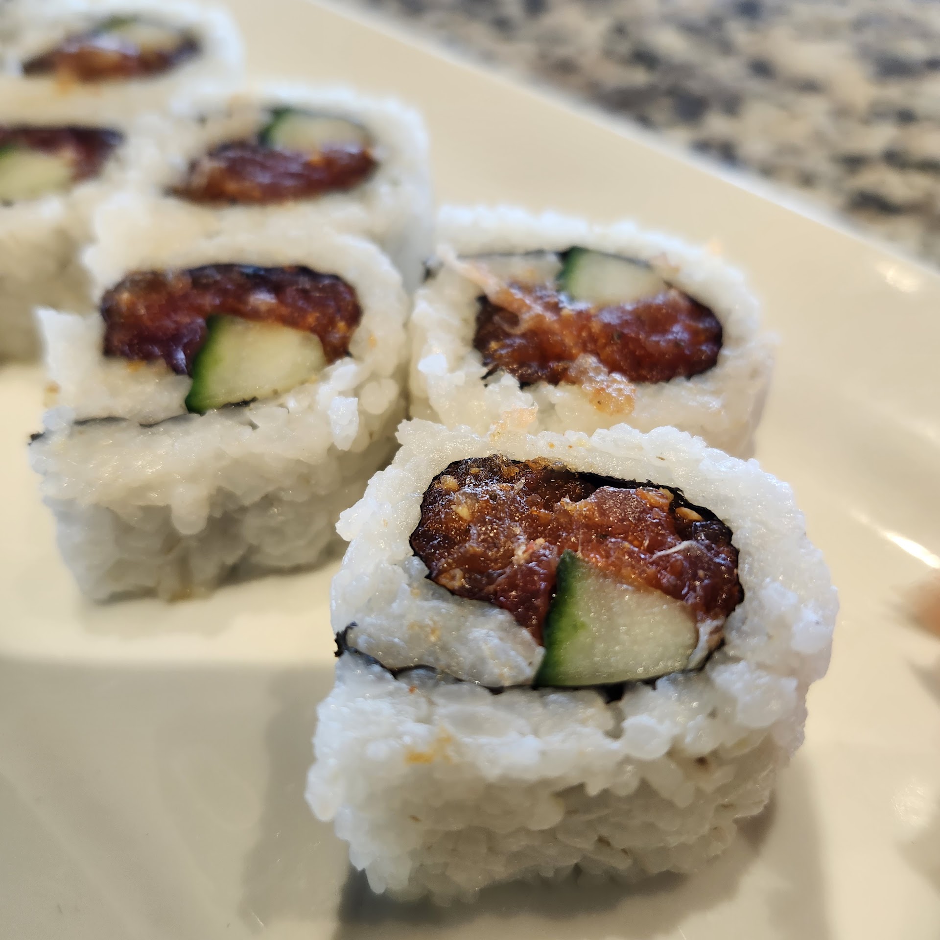 Moving on to the sushi, the Spicy California Roll was anything but. Traditionally, this roll features a balanced touch of spicy mayo. Instead, what arrived was drenched—no, drowned—in Sriracha, obliterating any possibility of flavor nuance. It was so overpowering that it became completely inedible.