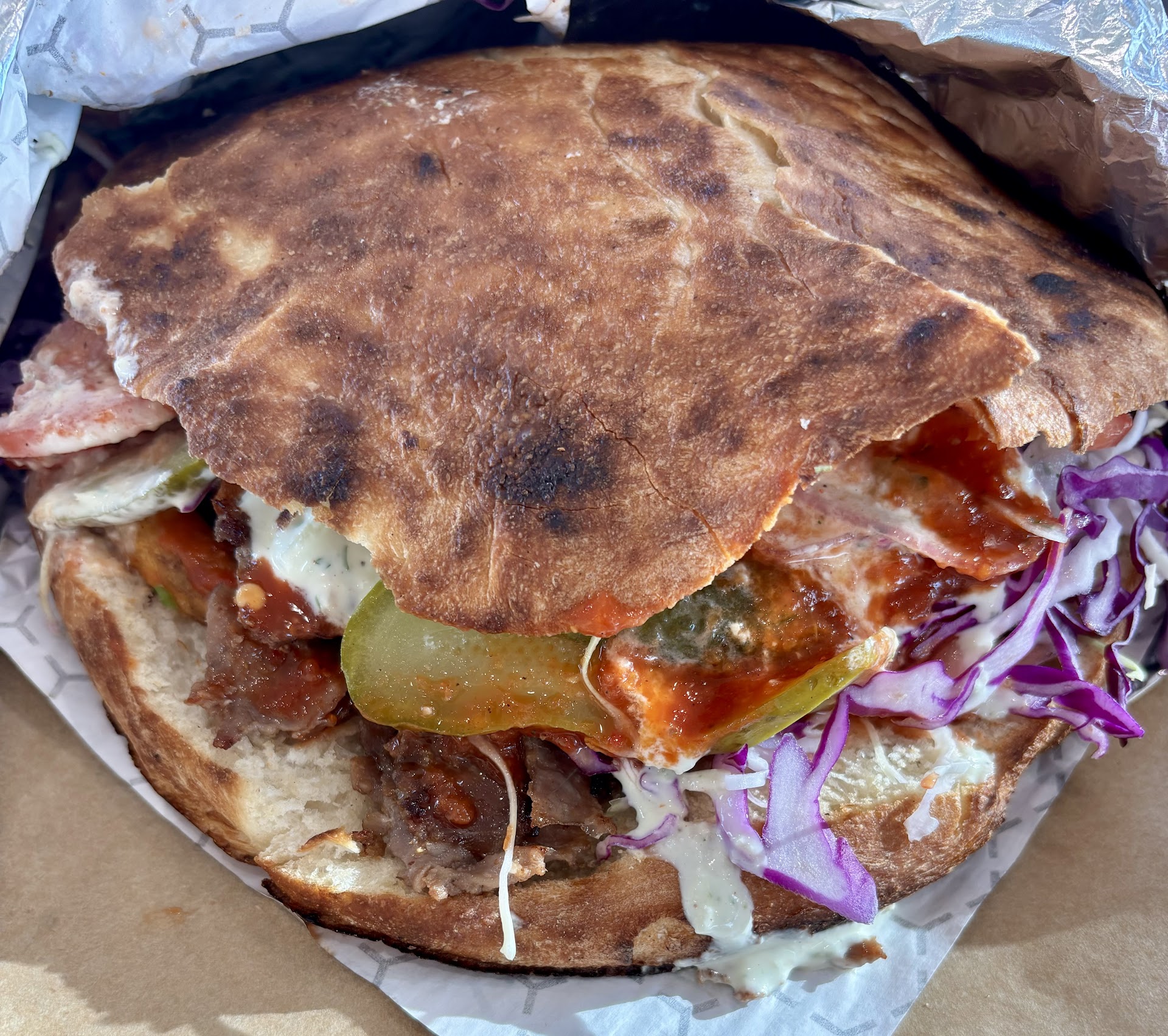With so much to choose from I went with the Beef and Lamb pita sandwich at the recommendation of one of the polite staff members. It was massive and filled with meat, onions, cabbage, parsley, tahini, and harissa. I divided it and half was plenty for me. I also got Stobi Flips peanut flavored puffs as a side. These lightly peanut/peanut butter flavored snacks from The Republic of Macedonia were delicious.