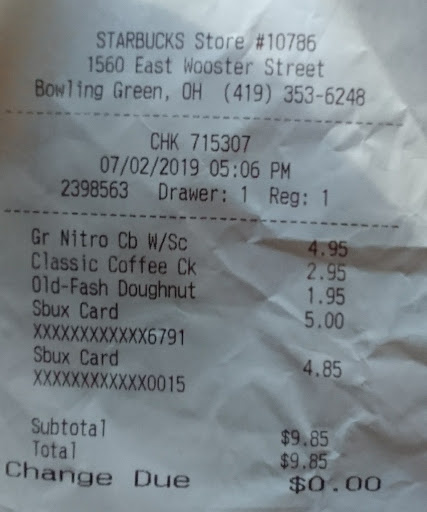 Read moreStopped in at 8:31 pm to get a coffee. They were cleaning machine so could not get a coffee. They said they have to clean the machine 20 minutes before closing. Asked what time they close. Said 9 pm. I said that is 29 minutes from now so would like a coffee. Said they couldnât. Asked if they could do a pour over. Said they didnât âhave the stuffâ for that. Asked for a manager or managers card. New manager and didnât not have any cards. This is not the 1st time or even 2nd time we have encountered this at this Starbucks. Sucks when you leave a BGSU sporting event, have a drive home, would like a coffee and you cannot get one. Very disappointing and very poor...
