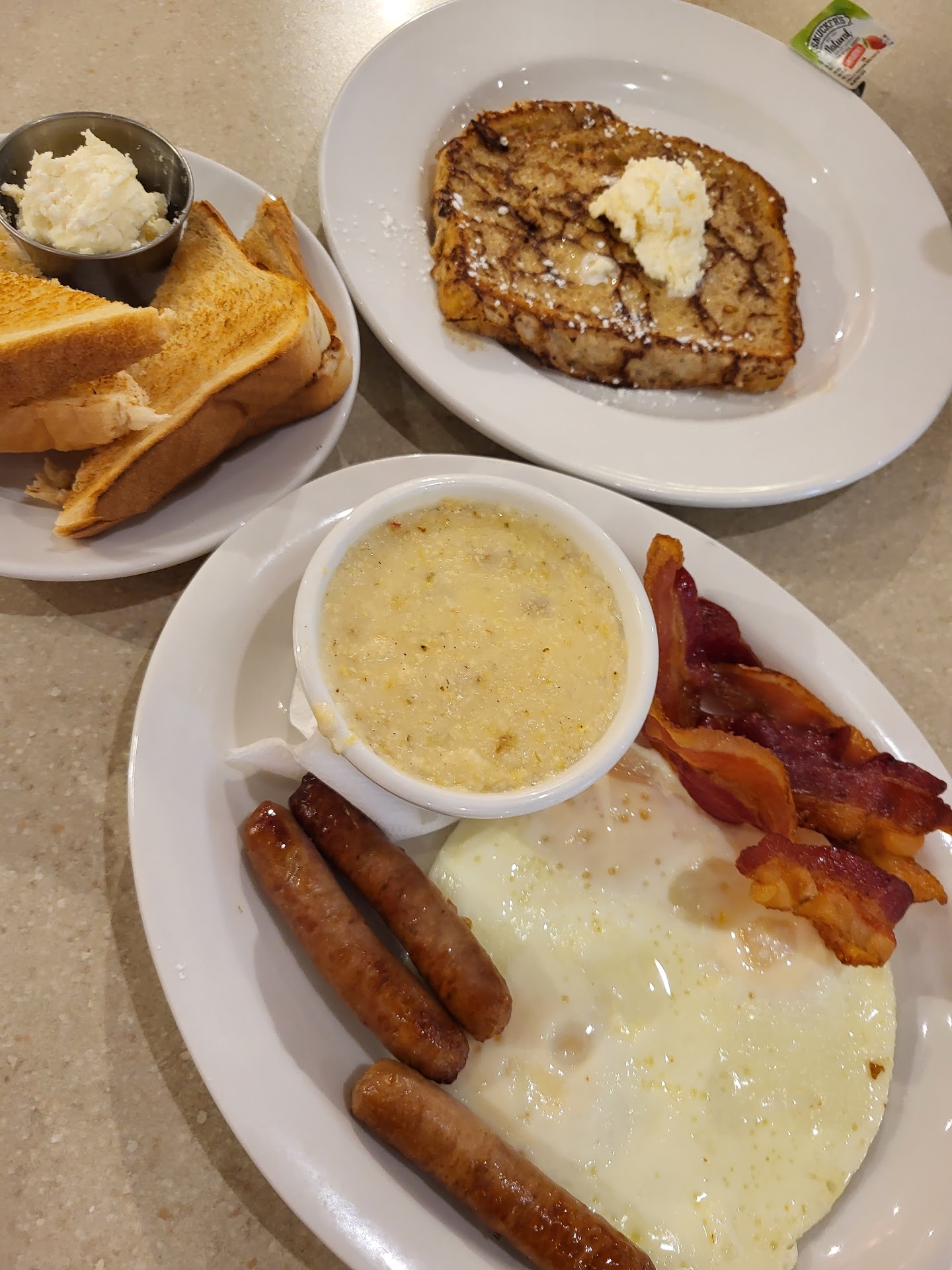 We were acknowledged quickly by a young man and we were seated quickly. The person who sat us was very pleasant. Shortly after being seat our server came over and introduced herself to us. Caroline was warm and welcoming. She took our drink order with a smile. She gave us plenty of time to make our selections as she could tell that we were not locals and did not know your menu by heart. With our orders submitted I had the Ace of a BLT and my friend had the build your own omelet. The food arrived in a timely manner. The presentation on both plates was very well done. I really enjoyed the Ace of an BLT. The sour dough bread was perfectly toasted. My egg was cooked as ordered and the bacon still had some life left in it. So many places way over cook their bacon that one bite and it shatters like glass. I really enjoyed my sandwich. If I had any complaints it would have been the avocado. Not that it made the sandwich taste bad. It made my sandwich to become slippery inside messy causing things to fall out of the sandwich like the egg. I finally gave up and finished with my fork. Next time I will hold the avocado. Grits were well made and perfectly seasoned. Caroline took all of out late additions in stride with a smile and promptly fulfilled.