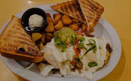 I got Kalamity Katie’s Border Benedict, and my wife got the Strawberry Tall Cakes. The food came out quickly and looked amazing, like magazine-cover quality. But unfortunately, mine was cold, light on chorizo, and had a strange sweet flavor that didn’t match the listed ingredients. I barely touched it.