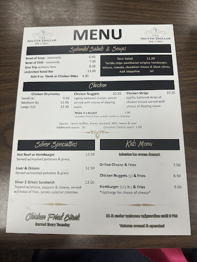 Ā Ā Ā Read moreGreat spot we discovered on our travels thru ND. Excellent feed, fantastic staff. Bill was accommodating, friendly, and bid us goodbye with a handshake. He shared his awesome potato masher with 2" ball which impressed us all, and invited us back for weekend steaks. We'll definitely plan to make this a stop on future travels. God bless the Silver Dollar (ya'll come back saloon)...