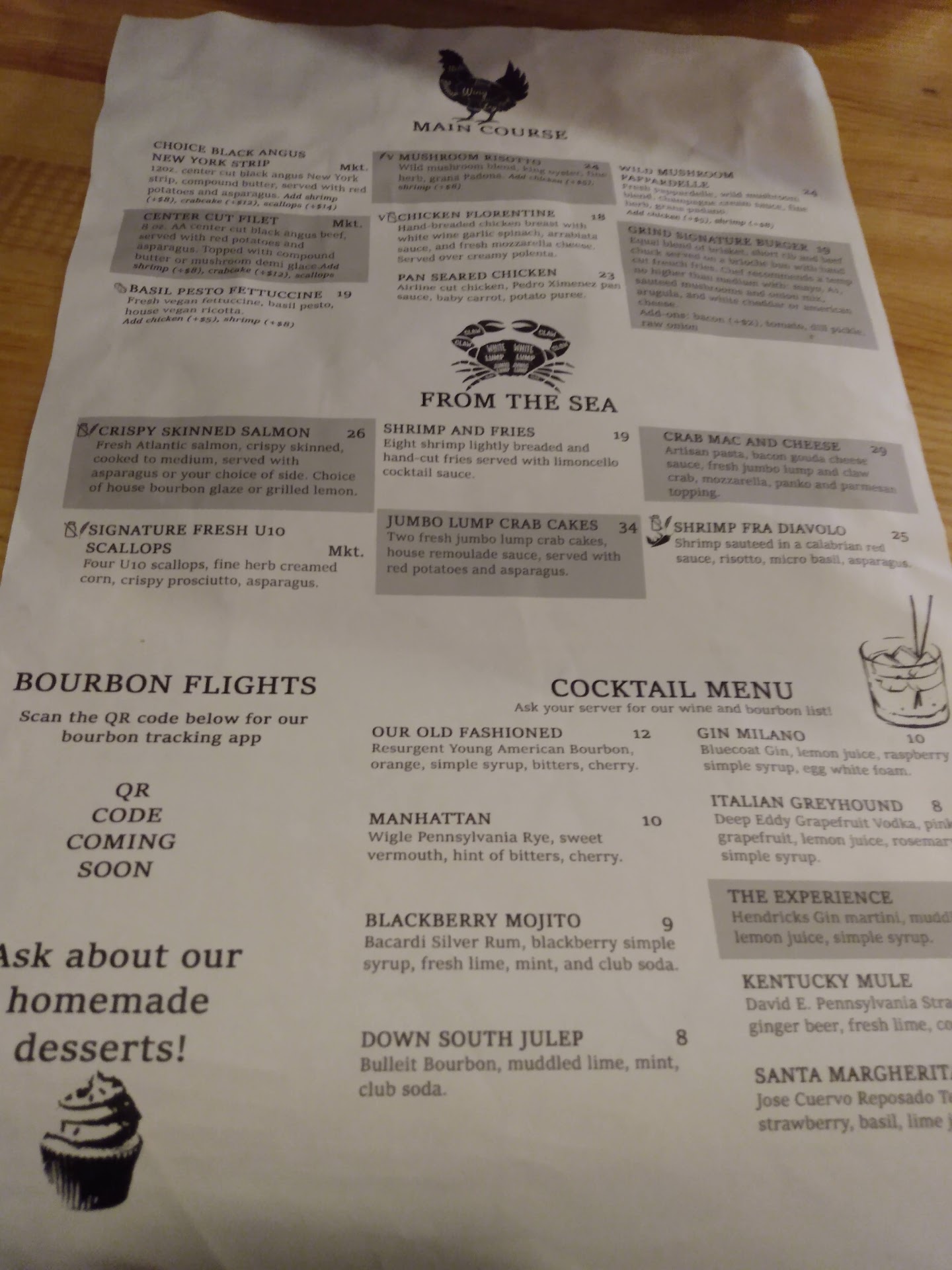 Read moreWe tried Grind our first time Saturday December 16th. The main restaurant area was busy but nobody was in the lounge. It took a couple minutes to be seated as they had to clean a table, not a big deal but the two hostesses seemed to not be doing much when we walked in. Our waitress came to the table quickly and asked for our drink orders, I was still deciding. I eventually ordered their special Christmas drinks, Santa's Cookie and it was delicious and a well balanced cocktail. We ordered the chicken, bacon, ranch flatbread. It was tasty but nothing special and could have used something fresh like chives. For our main courses we ordered the Chicken Florentine and chicken meatball as a grilled cheese sandwich. The chicken Florentine was delicious and crispy, the polenta was good but nothing special and needed salt and pepper. The chicken meatballs were soft, gummy, and had very little flavor. They were very unappetizing. The grilled cheese wasn't anything special, was well grilled on one side of the bread but not on the other and only had a couple slices of cheese perhaps American cheese. The spicy sauce that was served with it was okay and helped with some flavor but all in all not a good dish. Left a bad taste and did not settle well. I will say they had a good amount of people dining that night and other than it taking a considerable amount of time for my cocktail the service was phenomenal. I don't remember our server's name but she was especially great, informative and pleasant. A manager came by to also check on us and see if we needed a beer. I mentioned to him that I was still waiting for my cocktail. Overall nice atmosphere, great service, but the food was disappointing. The menu could use a few more options it is heavy on seafood which I don't really eat. It is a bit of a drive from us so probably will...