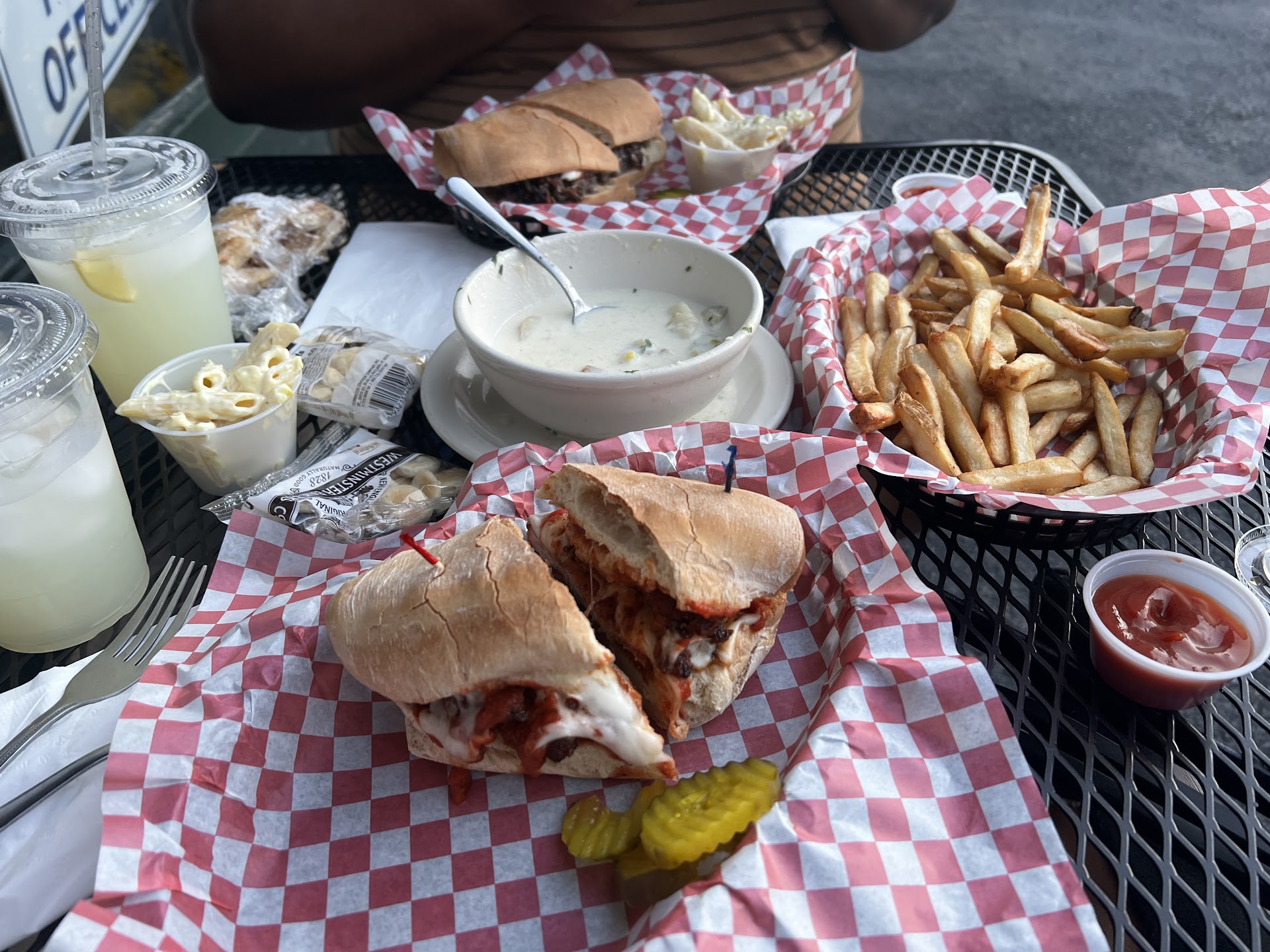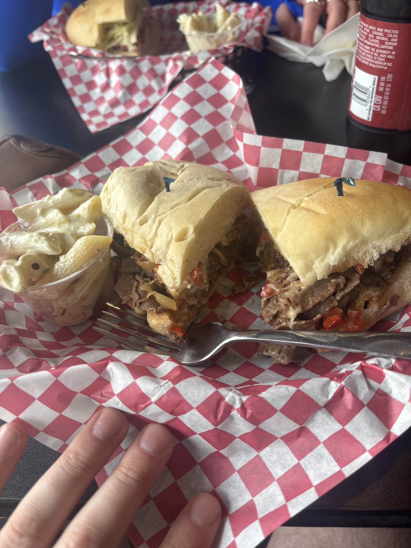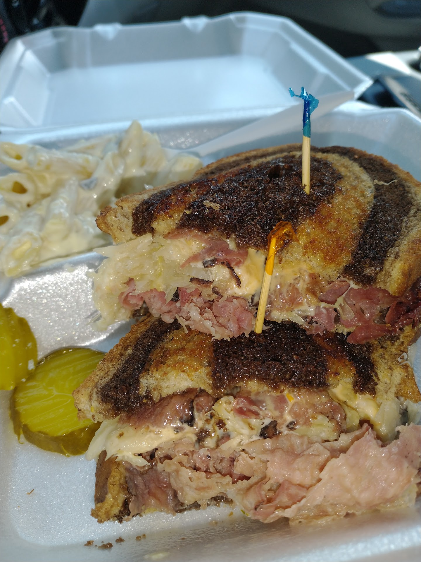 Read moreReuben, most of their sandwiches come with Mac salad and pickles. $8.77 including tax. I ordered an Italian sandwich (Corleone) a couple years ago which was pretty good, so gave it another try. Mac salad is pretty good, and nice portion size. Came with a measly 2 slices of pickles. The sandwich was not very good this time around. The pastrami was almost all fat, super chewy and grisly, couldn't even eat some of it. There was too much sauerkraut and not enough meat. The bread was fresh, crisp and delicious. Maybe having an off day but very disappointed...
