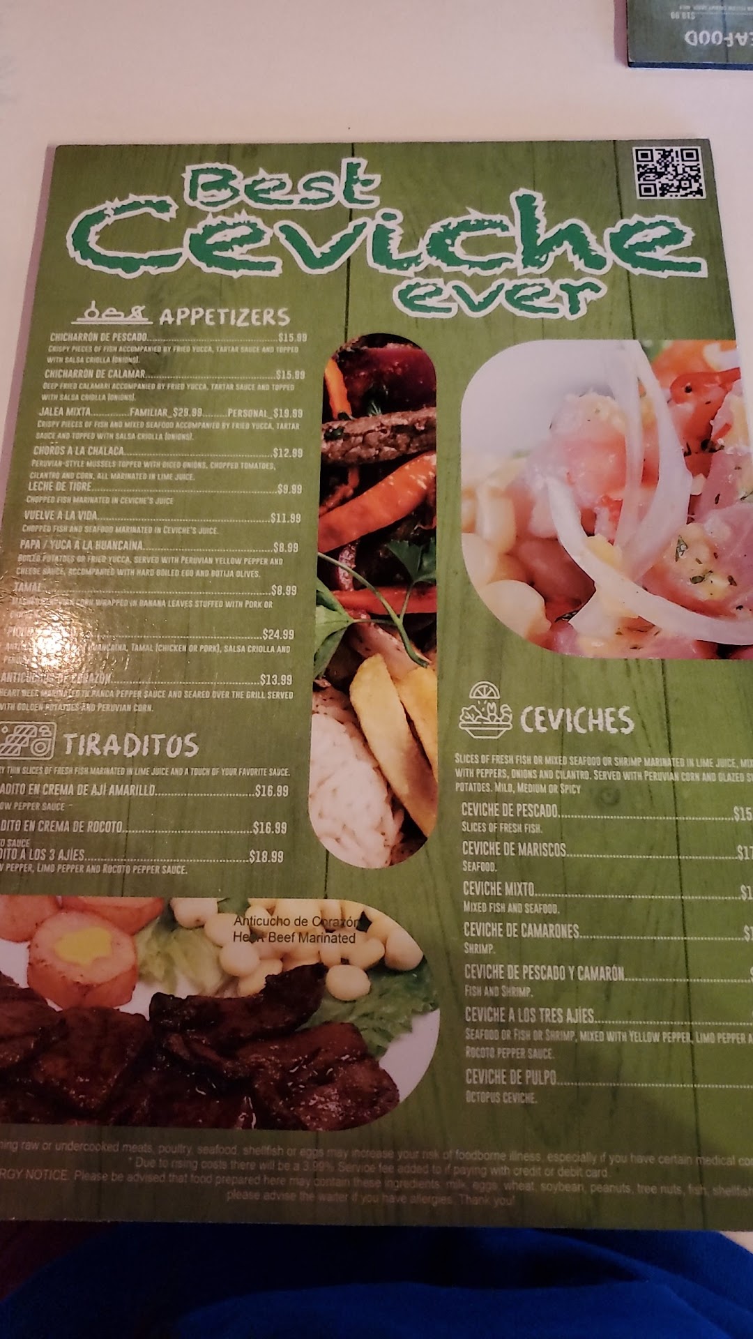 It was okay at best. My first impression of "Best Ceviche Ever" as I walked is was very positive, the decor seemed modern at first glance. As I was seated I literally fell through my chair. The furniture is made of a cheap plastic patio-esque material, and the seat to my chair had been placed on incorrectly which resulted in me falling through! But no matter, that didn't bother me.