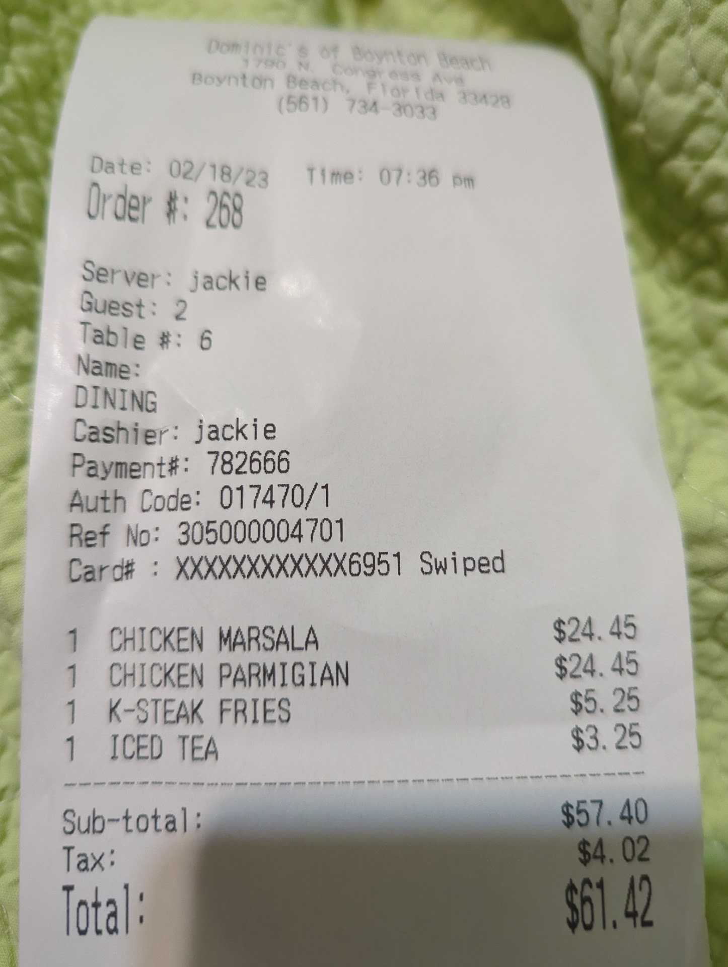 I have been a customer of Dominic’s since moving to Boynton 8 years ago, and last night I had a very displeasing occurrence. I placed my order at 5:25 and was told that delivery would be 1 hour. I called back at 6:35 and was told my order had just been put in at 6:18, which I did not understand since my credit card was charged as I hung up the phone. I then got a call back saying they made a mistake and my order was coming out of the oven right then and would be leaving with the delivery driver.