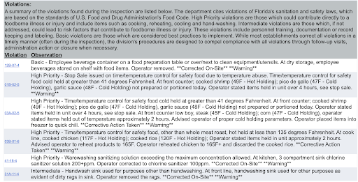 West Palm Location, Sept 2025 12B-07-4 Basic - Employee beverage container on a food preparation table or over/next to clean equipment/utensils. At dry storage, employee beverages stored on shelf with food items. Operator removed. Corrected On-Site Warning 01B-02-5 High Priority - Stop Sale issued on time/temperature control for safety food due to temperature abuse. Time/temperature control for safety food cold held at greater than 41 degrees Fahrenheit. At front counter; cooked shrimp (49F - Hot Holding); pico de gallo (47F - Cold Holding), garlic sauce (48F - Cold Holding) not prepared or portioned today. Operator stated items held in unit over 4 hours, see stop sale. Warning 03A-02-5 High Priority - Time/temperature control for safety food cold held at greater than 41 degrees Fahrenheit. At front counter; cooked shrimp (49F - Hot Holding); pico de gallo (47F - Cold Holding), garlic sauce (48F - Cold Holding) not prepared or portioned today. Operator stated items held in unit over 4 hours, see stop sale. At front counter low boy, steak (45F - Cold Holding); corn (47F - Cold Holding), operator stated items held out of temperature approximately 2 hours. Advised operator of proper cold holding parameters. Operator placed items into freezer to quick chill. Corrective Action Taken Warning 03B-01-6 High Priority - Time/temperature control for safety food, other than whole meat roast, hot held at less than 135 degrees Fahrenheit. At cook line, cooked chicken (117F - Hot Holding); cooked rice (120F - Hot Holding); Operator stated items held in unit approximately 2 hours. Advised operator to reheat products to 165F. Operator reheated chicken to 165F+ and discarded the cooked rice. Corrective Action Taken Warning 41-18-4 High Priority - Warewashing sanitizing solution exceeding the maximum concentration allowed. At kitchen, 3 compartment sink chlorine sanitizer solution 200+ppm. Operator corrected to chlorine sanitizer 100ppm. Corrected On-Site Warning 31A-11-4 Intermediate - Handwash sink used for purposes other than handwashing. At front line, handwashing sink used for other purposes as evident of dirty rags in sink. Operator removed the rags. Corrected On-Site Warning