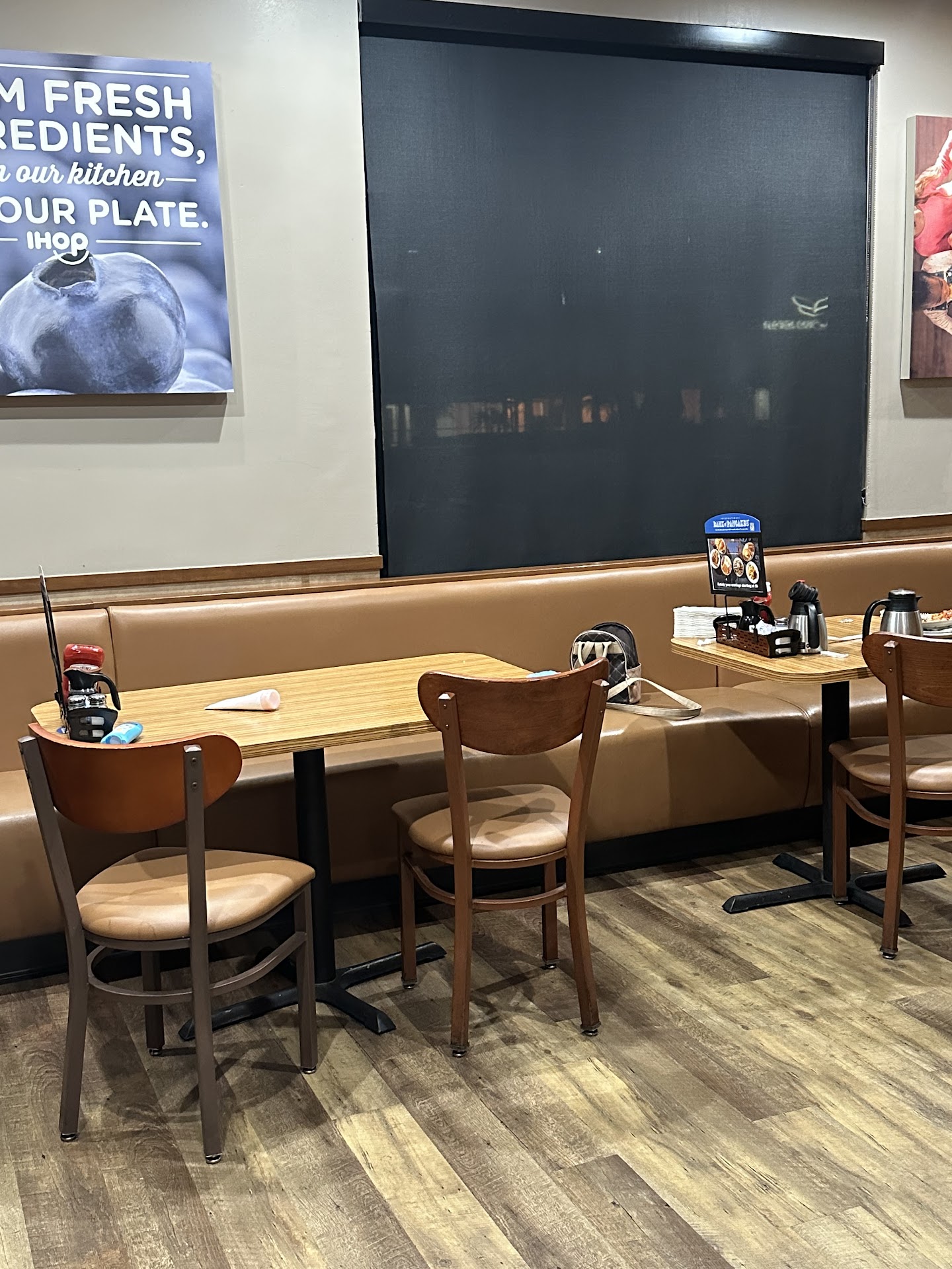 Worst IHop I've ever been to 9n my entire life. Only one waitress and one cook to mind the whole place. The poor waitress only had one eye. Definitely needed more help in there. The order waz wrong and took forever. She can't wait on a place full of people and being one person. No manager there. I ordered basted eggs, which is supposed to have a runny yellow, didn't order sunny side up, because the yellow always comes back totally hard. This did too, was cold, ordered bacon got sausage which not supposed to eat because I've had colon cancer. The butter we had to wait for after our meal was put on the table. I ate half my pancakes wo any. I got up to see if they had any out in a bowl by the kitchen and the waitress got pissed at me. I chalk all this up to management and no training in cooking or people skills, plus not enough help. 2 people nust isn't enough to run a restaurant, especially in early evening. It was about 7 pm, but that place sure was jamming and during the week too. Bad bad management totally. I'd fire his ass for sure. Never go back unless you want to wait on yourself and hope you get clean stuff. When we first got there there was a pitcher of old cold coffee sitting in a pitcher on the end of the table. They were on all the tables. It was almost empty. Bad bad place to go for food or Service. Fire that manager, ckean the place up, and fir God sakes, hire some DAMN...