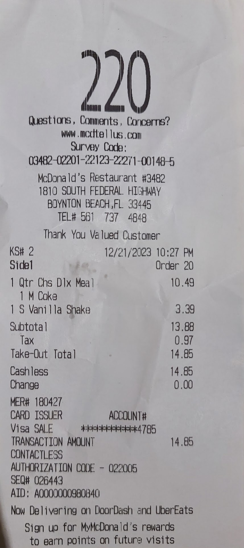 I have never had more offensive service at any establishment in my life as I just had. This girl with braids, a hoodie that said '23 senior (obviously her school hoodie) and zero McDonald's attire on, aside from a blank visor, somehow managed to take my order without looking at me, or speaking nearly a single word. No please, no thank you, no order total, just stood there staring at the floor/screen. I asked how are you and she just said nothing. I placed my order and she said "size" I replied "medium" she said "that's all". These weren't questions. She just muttered those words and those were the only two words this little monster of an employee could say. I worked at McDonald's 20 years ago and I've been coming to this location for 4 years. Fire this despicable excuse for an employee. She was disrespectful. No greeting, and then when my order was placed she just turned and walked away. When my food was ready she tossed it on the counter and walked away. She didn't call me to tell me that my food was ready or anything at all. I had to go up and check the order to see if the number and ingredients matched. I said thank you at every interaction and got nothing in return. This is disgusting behavior and would've gotten any employee fired when I worked for McDs. Then as I'm eating my food, what appears to be the manager walks through the dining area having a loud speakerphone conversation in creole and also zero greeting as she walked by me. Just a blank stare. I'm shocked and disgusted. I almost exclusively give 5 star reviews, or no review at all. It's so easy to get 5 stars from me, and I wish I could give zero stars in this case. They only get 1 star because it's the lowest possible option. This is my receipt attached so you can find the đď¸ employee who's responsible for losing a 4 year customer to...
