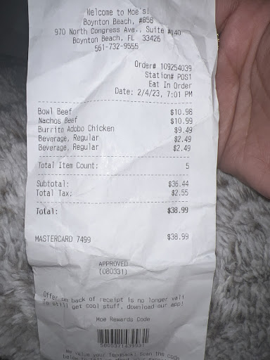 Ā Ā Ā Read moreDO NOT...I REPEAT DO NOT EAT AT THIS LOCATION. After the second recent visit I realized very quickly that this place has to be under new management. My first recent experience I ordered a Home Wrecker and they tried to charge me extra for Guacamole. I informed them that the Home Wrecker comes with Guacamole. Then when they attempted to close my burrito they made a complete mess of it. I figured that it was a fluke and just paid. On my next visit I noticed that the portion sizes on everything were a lot smaller. My wife got a bowl and you could pretty much see the bottom. She asked for extra lettuce and they gave her a pinch, she had to ask the employee 3 separate times to add more. On top of that every little thing costs extra. I watched one of the employees fill 3 different cups of Queso for other customers and fill filled it halfway. When he fill my cup I had to tell him to fill it to the top. Then when we were paying I asked for extra chips because they barely gave us any even though I got Queso. They charged me $2 extra for chips. My total also came out to $33, I only ordered $24 worth of food as I always do. I disputed the total and the female said it was correct. I told her to check again. Then she said "oh yeah" and magically my total was $24. Accident? maybe? The wait was really long even though there weren't that many people there. Another customer near me complained about the long wait. Halfway through paying the cashier walked away with out giving me my receipt. I had to reach over and grab it from the printer myself. I am not an unreasonable person and I never write reviews but the totality of my experience at this location forced me to put the word out. DO NOT EAT AT THIS LOCATION!!! I do not think they will be around much longer anyway running a business like this. I love Moe's but I will never eat at this location again and I am going to call their corporate office. 1 star is way to high so I give...