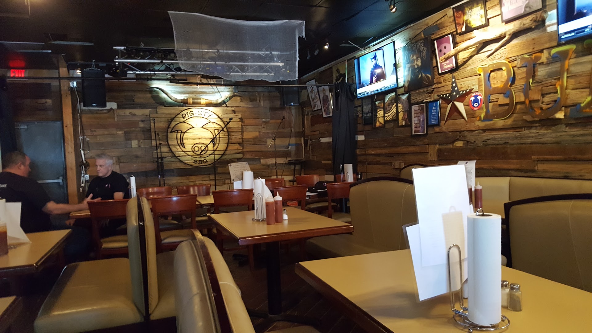 We were there around 6 and only maybe 2 tables were already sat, and the few in front of us and then the bunch behind us. When it came to getting the drink, I found that the iced tea dispenser is next to the swinging kitchen door. The dispenser is literally fractions of an inch from the edge of the door. What that means is when someone comes out of the kitchen, the doors whacks you right in the arm. When it came to the condiments for the food and french fries, you need to get up and put them in cups. And they were out of ketchup. There were two BBQ sauces on the table, thankfully I didn't need to keep getting up for that. I loved the sauce. it was very good. I like spicy so I used that. However, I tried the one labeled "mild" and it was so close to the spicy that I concluded that someone must have mis-filled it. I was able to get a few squirts of sauce on the tray until the container became clogged. I gave it a good squeeze and it went all over the place. Then, I went to get more and this time, it was stuck for good. The brisket was pretty good but it was definitely leaning towards the "too-salty" end of the spectrum. The pulled pork both smelled and tasted like a wet dog. The fries were burnt to a crisp, cool, and just not very good. The mac-n-cheese had a good consistency but frankly, I needed to remind myself it was mac-n-cheese because I wouldn't be able to tell...