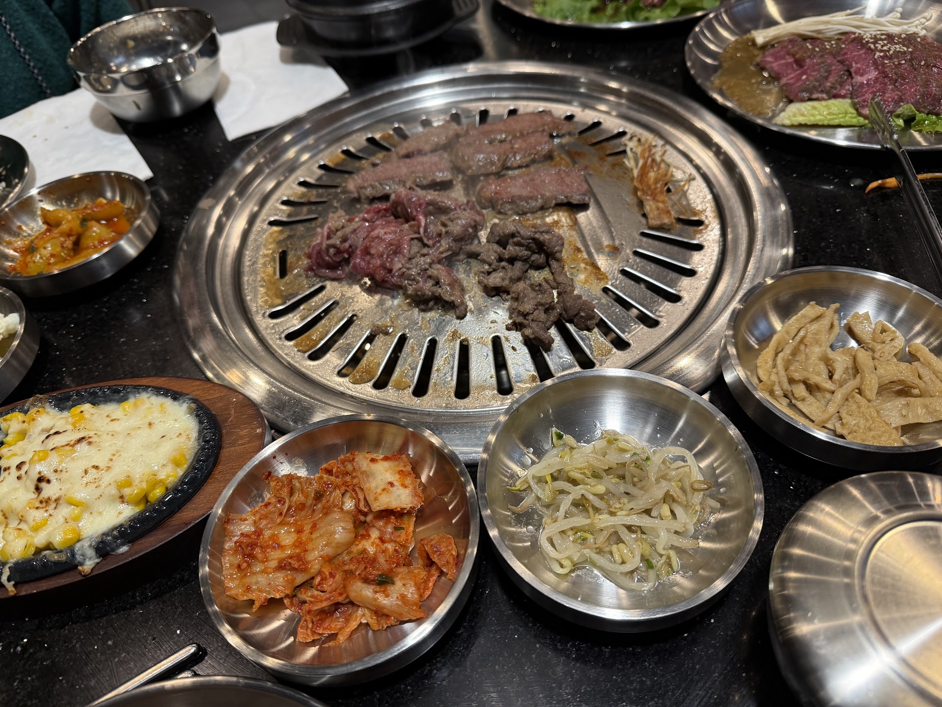 We were seated at a table and scanned a QR code to look at the menu. We were 2 adults and 1 kid. They allowed us to order the meal for 2. It was plenty of food. We had received 2 meats to cook, rice, jabchae, salad, soup, corn and cheese appetizer, and side dishes. All for $100. Service was also a 10/10.