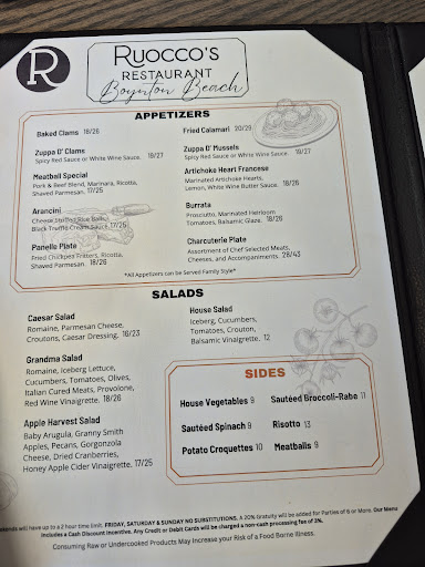 I saw a bunch of friends originally from Brooklyn posting on social media that their favorite New Jersey restaurant, Ruoccoâs was coming down to Boynton. Then I saw that it recently opened so we decided to go and check it out. Three out of four of us are from Brooklyn and we found out the owner, Steve Ruocco is from Brooklyn as well. Super nice guy, very friendly. He spent time getting to know us. Service with D was fantastic. All of their staff was great and stayed on top of the service. We tried the meatballs and baked clam appetizers. Both were really fabulous. Sauce was a little sweet (how I like it). Steve Ruocco recommended the pork chop so my husband tried it. He said it was one of the best he ever had. We also tried chicken Parm, chicken franchese and chicken Scarpariello. Everything was really delish!! Nice sized portions - enough for the women to take home leftovers. We told Steve that we were too full for dessert but about five minutes later he brought over a plate of mini cannolis. Really awesome thing to do!! I think the restaurants only open a few weeks ago and you would not know it. Service was spot on. We will definitely go back and try more things soon. ...
