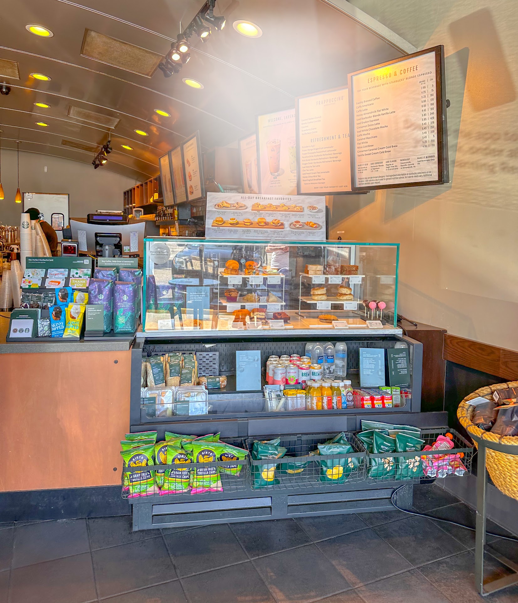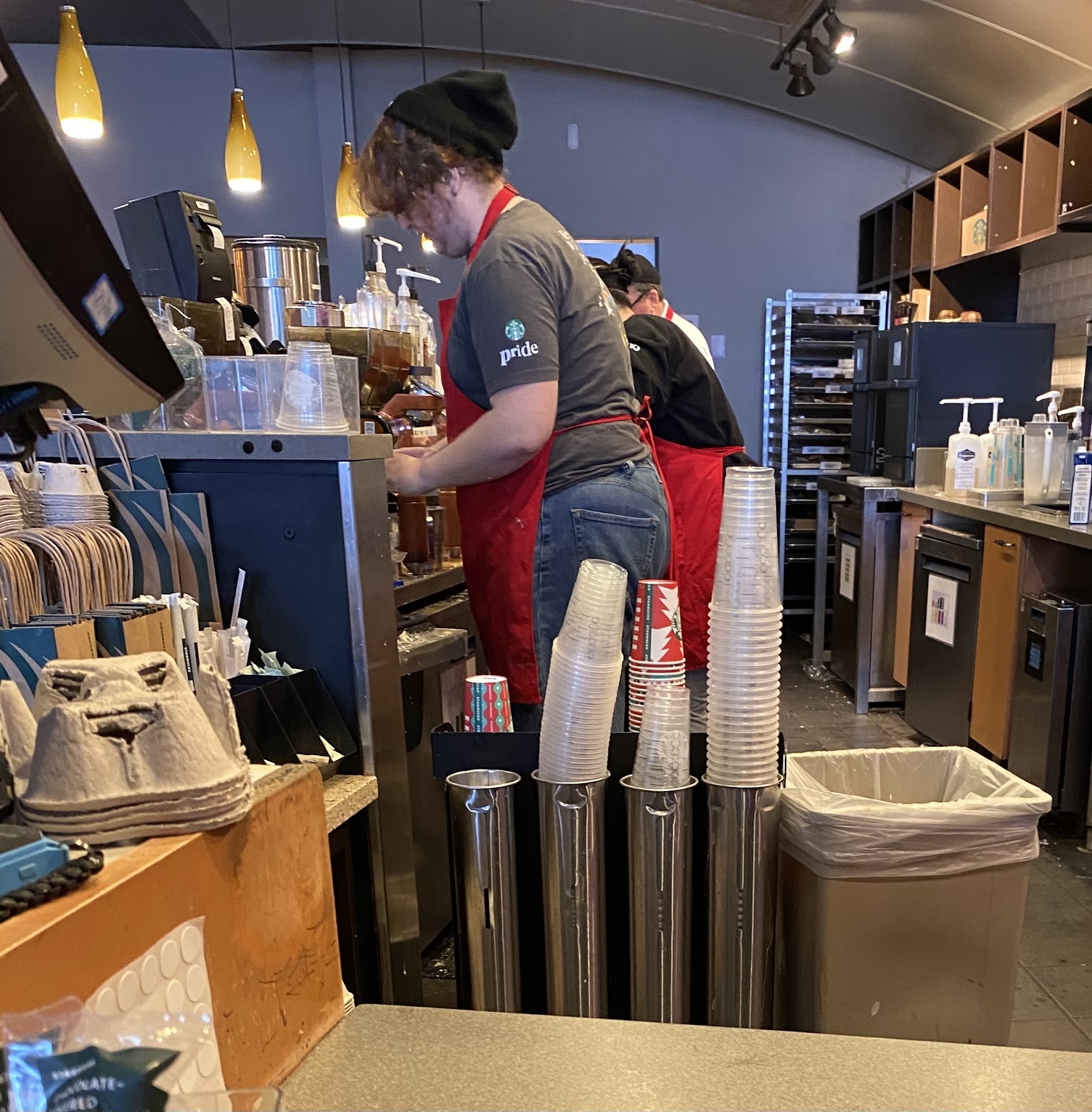 If I could give this Starbucks 0 stars that’s what they’d get. The first Starbucks I went to on Federal Hwy& Woolbright was filthy, we walked in all employees turned and looked at us then turned away without an “I’ll be with you in a minute” or even a hello. We stood there for ten minutes waiting to be acknowledged yet nothing as I stood there I looked behind the counter (I’m a barista in CA so I understand standards) their sanitizer buckets were not clear liquid they were rags going into water so dirty it might as well have been milk. After seeing that I had seen all I needed to see so we went to another Starbucks, this location I’m reviewing. While we did get greeted the place was absolutely filthy I didn’t think it could get worse than the one before but while my partner ordered I looked at what was happening behind the counter. Not only did they all seem to be accomplishing nothing the photo I’m attaching will tell you all you need to know. I didn’t even want to get the drink after seeing the place. Carmel bags on the floor and milk and syrups spilling from the counter down the fridge to the floor. Instead of taking two seconds to wipe it off I watched the employee set a Carmel drizzle bottle and multiple drink cups down in the mess on the counters which then means the Carmel bottle sitting in who knows how long the guck has been on the counter is now transferring into my drink as he pours Carmel on. Not only that but I watched him make my drink and while I ordered blonde espresso the espresso was not taken out/cleaned or refilled it was just simply run through again also assuming it was their typical medium roast beans. Meaning it was used to pull espresso at least three times once which led it to be used and in the machine before ours and twice for my partner and I’s drinks. When I received my drink there was the tiniest bit of Carmel drizzle in there after I paid extra for it, the coffee also tasted like water and milk with the littlest hint of coffee. The sheer amount of laziness and disregard for the health violations happening here is disgusting. I will not be returning and I seriously hope you guys get some help in there or at the least some training and common knowledge...