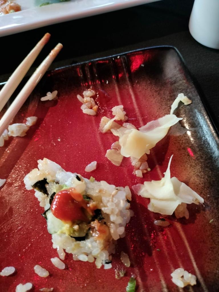 Then came the main dish, which was always my favorite at this restaurant and it’s large. My sister and I had wanted to share it. It was the Volcano Roll, which I’ve had many, many times before. Here comes a crowning glory: the rice was soggy and never stuck together, often mushy, you could not pick it up it was rolling in the same sauce the same sauce as before! In this dish, the fish is seared and is hot with a bit of mayo but this was cold and soggy, unappetizing and not the same dish. Then there was supposed to have been whitefish in there, but there was no whitefish: possibly because we had asked to remove the imitation crab. So it was all in all, thoroughly disappointing. The rice had no flavor except it was mildly sour, it didn’t even taste like proper sushi rice it’s more like you’re eating salmon and rice and sauce with a kind of soggy salmon. If not for the sweet eel sauce, it would have been flavorless.