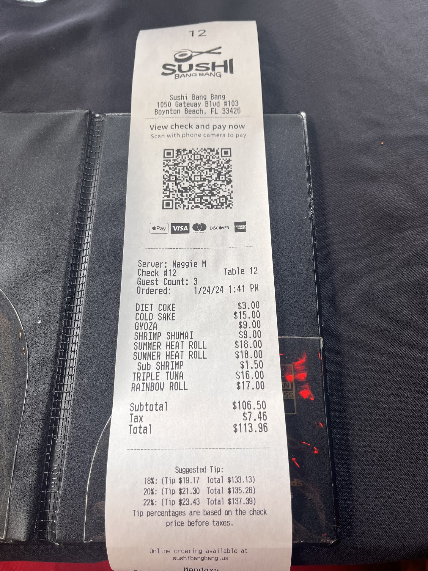 Read moreThis restaurant, for some reason seems to believe shrimp is more expensive than salmon. After several times of coming to the restaurant and ordering the routine, same dish on several occasions due to the fact that this restaurant is close to my office, I have never been charged $1.50 substitution charge For the dish that I always order. I always order the summer heat roll and substitute the salmon for shrimp tempura. I also always request no jalapeños due to not being able to support spiciness. Today Maggie Was very unprofessional due to the fact that, even though I paid the check and wanted to explain my situation to her, she still had no remorse and no consideration for a routine customer that comes often as well as brings clients to this location for frequent lunch visits for a substitution charge for replacement of salmon to shrimp tempura. In all reality, I have never seen Shrimp tempura being more expensive than salmon. I understand that I am doing a substitution however, it is actually a In which the owner can charge me the full $18 for one roll and not spend the cost of salmon. I was quite shocked to hear that $1.50 would hurt this restaurant so bad to the point of losing a routine customer that comes in and spends a minimum of $100 each visit. It’s sad that they lost a routine customer over $1.50. Maggie tried to explain to me that there is a disclosure on the menu stating that any substitutions would be $1.50 however, this disclosure is not on the menu They provided to me therefore this is just a way of trying to bring up prices to take from customers. Highway robbery at its finest. The blue light in the bathroom is not something I’m a fan of as it blinds you when you get out since it’s so dark inside it. So sad, but Maggie is the manager and the owner she claims is her father. Sometimes family owned businesses are nice but this one isn’t...