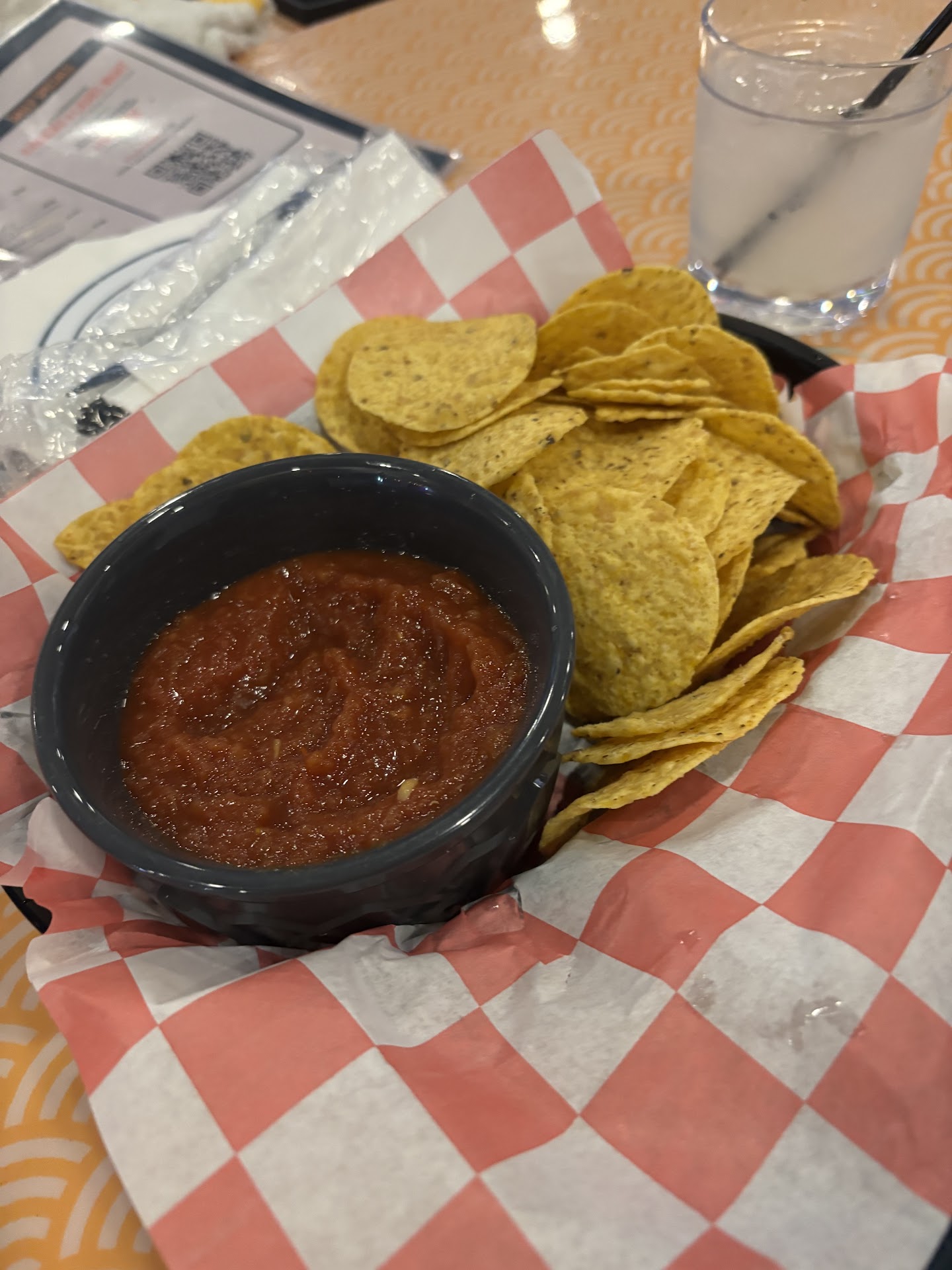 Now for the not-so-great part. We ordered chips and salsa to start — nothing fancy, just Tostitos and store-bought salsa, but I wasn’t expecting much. What stood out was the service. The chips came out with no plates, so I asked our server (who never introduced himself, but had locs) for some. He brought over a stack of napkins instead, and it took another 15 minutes before we got plates.