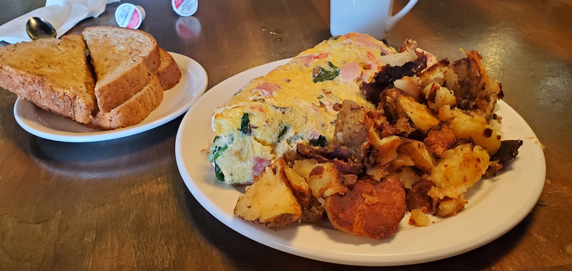 We had an avocado eggs Benedict with 3 poached eggs, poached to perfection, grilled tomatoes and home fries. So delicious and the Popeye omelet with ham and Swiss and your choice of toast. These were both excellent, and again, so generous.