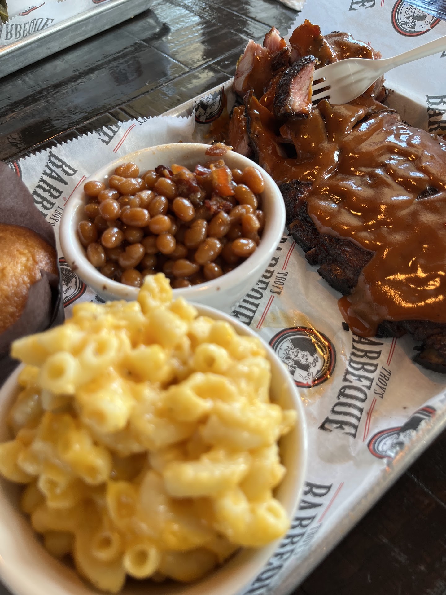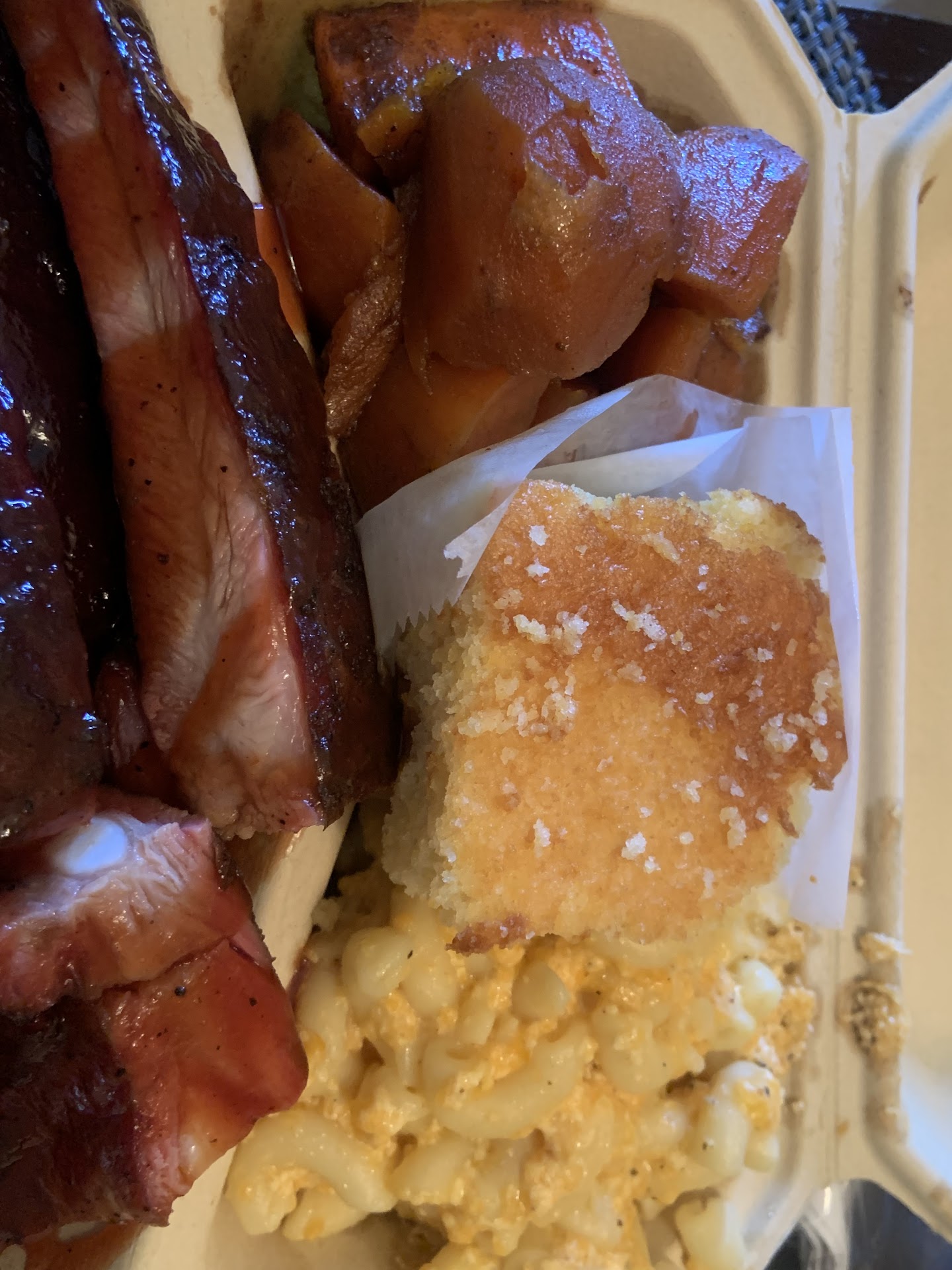 The first time that I came, I spent $30 on a combination plate and what I got was disgraceful. When they handed me the bag through the drive-through window, it didnât even feel like anything was in the bag. I ordered the brisket/Rib dinner w/ the two sides. The brisket that they served me seemed like old dry deli meat. One piece was just in a big hard chunk. It was the butt end of the brisket and it was cut entirely to thick along with two very small slices about 2 inches long each. The mac & cheese was trash and the greens were so salty that I had to spit them out. They werenât edible at all. So to serve greens in that state is just irresponsible. The only fairly decent thing that they gave me were three tiny little small ribs.