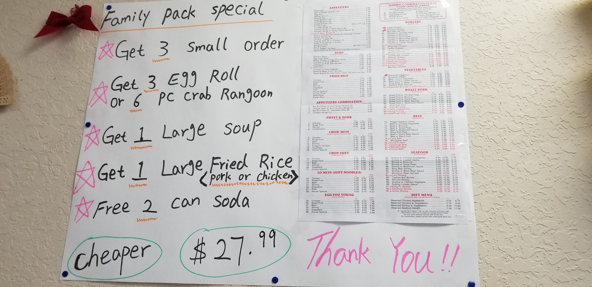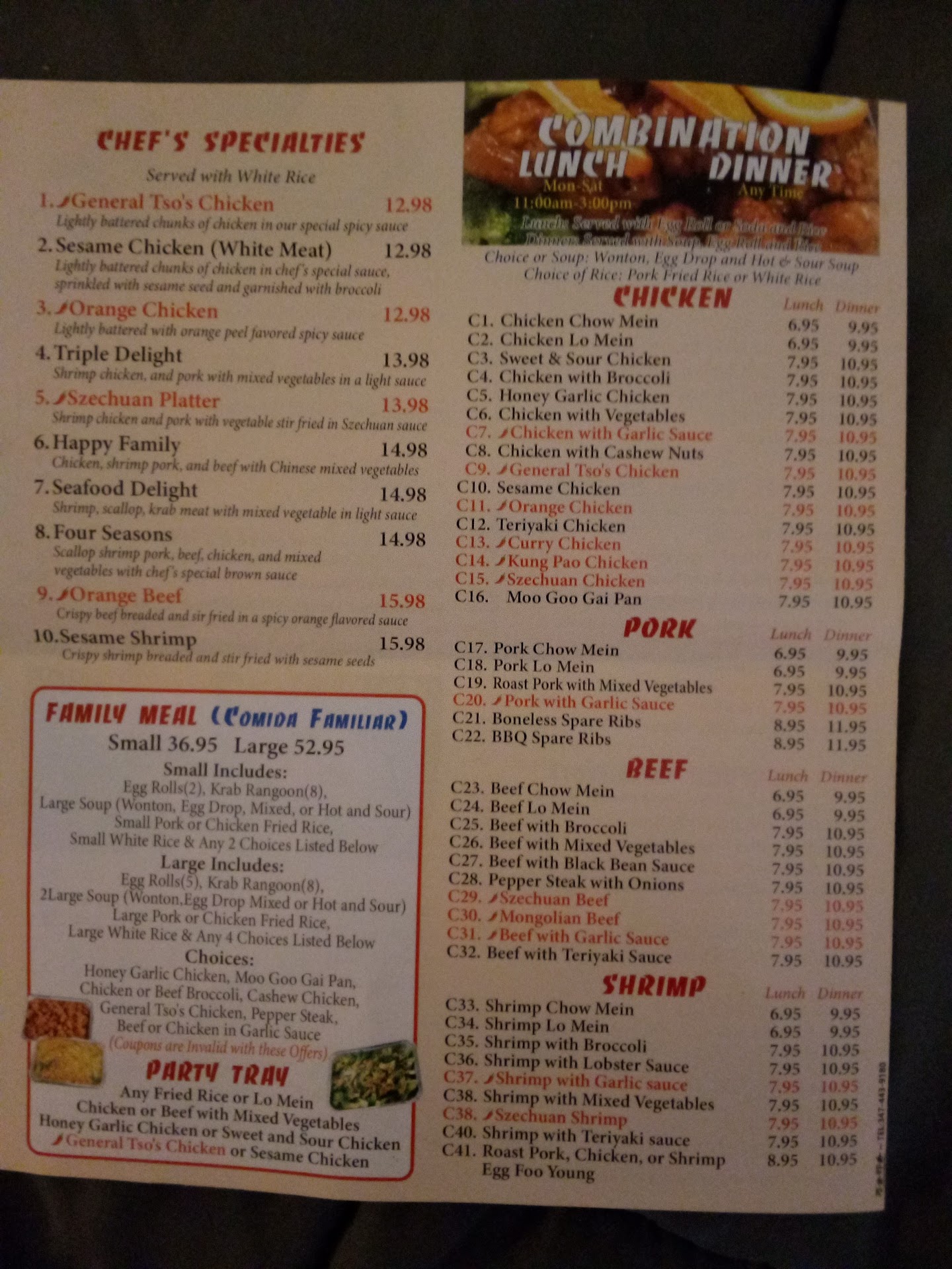 Read moreMy first visit to this restaurant. Ordered on line and food was ready when I arrived. I stood at the window while the girl took phone orders. I get it, she was taking care of the calls that came in before me, however she continued to answer the phone rather than put them on hold and take care of me. Thats my first issue. Then after I arrived home we found one of our meals was missing. Called back and the young woman was slow to take care of me, let me check those orders she said, on hold waiting again, feeling like I'm at fault. Finally, they could deliver it to me in 30 minutes or so. I only live 10 minutes away so I went to get it. As anyone can see, I own a business and know how important customer service is. I know you can't please everyone. I was offered a soft drink for my troubles. Now I love Chinese food but I didn't like there food. The 3 varities of fried rice were tasteless, my green peper steak and onion had pleanty of vegtables and little meat. The meat was tough, the brown sauce it was in was great but that doesn't make up for the lack of meat. Wife had broccoli and beef. Same with her order although she said her meat was very tender. I don't write reviews very often, mostly when I have a great experience. This is not one of them. I will not be returning to this restaurant. And lastly, the cooks were not wearing masks, gloves, hats, and were handling food with their bare hands. Hope you have a better experience if you choose to go...