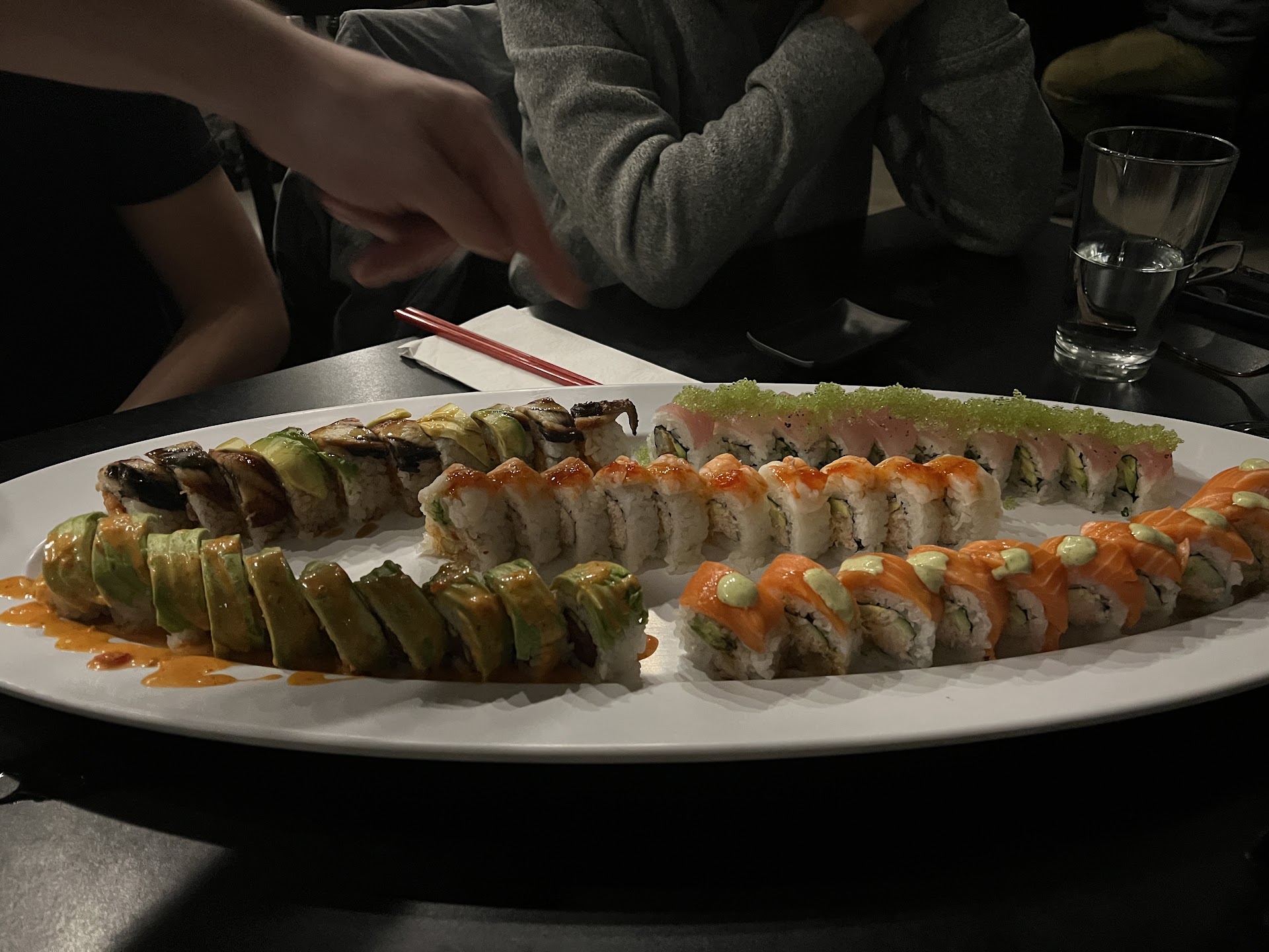 The sushi took a very very long, much longer than usual, like 40 minutes, and when it arrived it looked very underwhelming and very simple. First of all the shappenin was not good at all because the flavours did not seem right and it made me choke. I personally hate avocado so i removed the top layer. The other ones it was quite hard to taste the fish; it was rather bland and the rice was overpowering. On a positive side i enjoyed my meal because the sauces were nice.